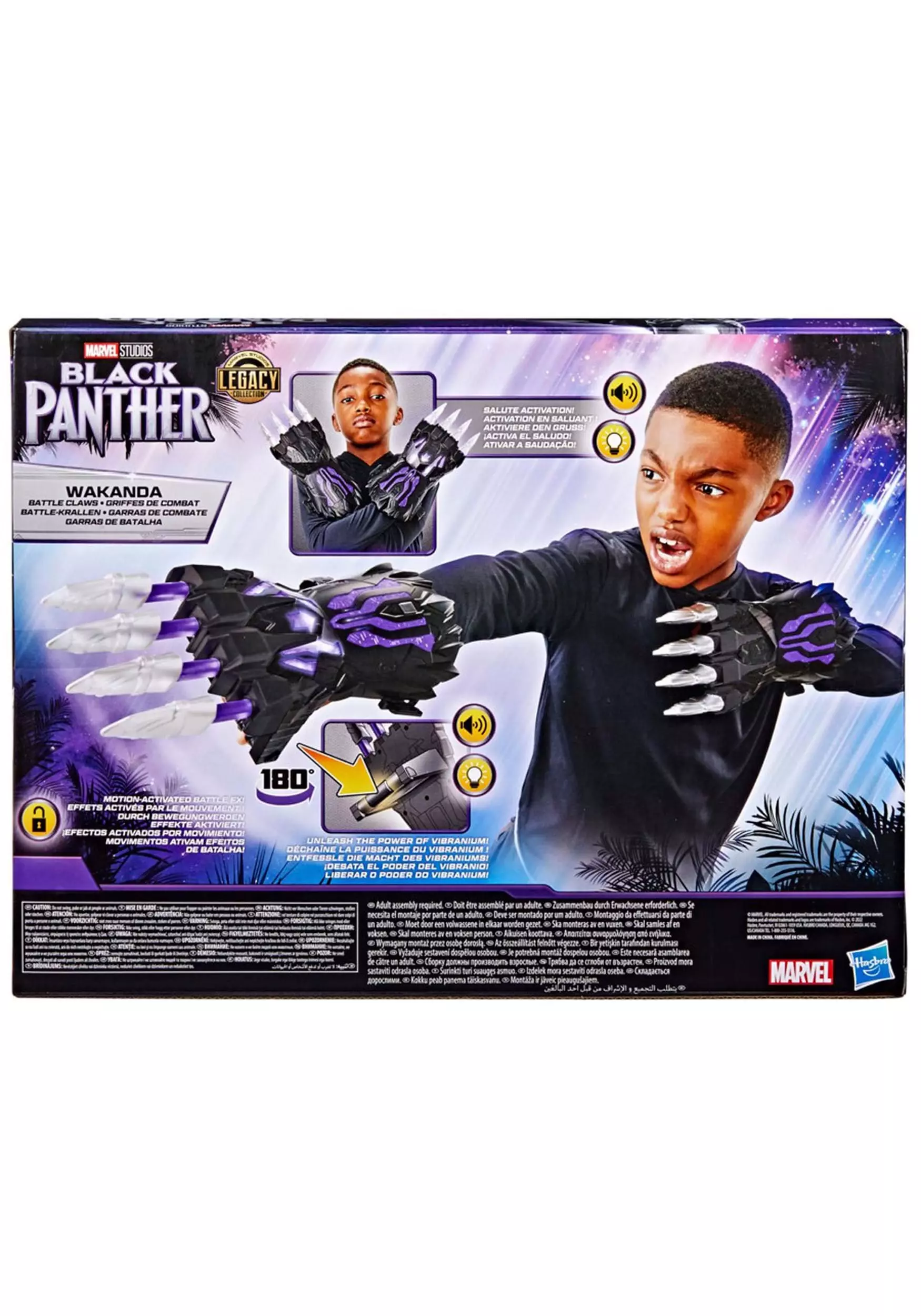 Suit up for battle with a pair of Black Panther Wakanda Battle Claws Accessories! The pair of black plastic claws strap onto your wrists via adjustable straps fitted with parachute buckles. Purple designs decorate the backs, and the silver-tone plastic claws extend when activated.Â
