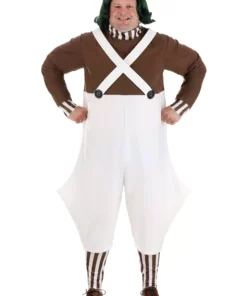 Is the chocolate factory hiring? This officially licensed, exclusive Adult Willy Wonka Plus Size Oompa Loompa Costume will help you to fit right in! The polyester jersey knit and fleece jumpsuit fastens up the back and is designed to look like a chocolate brown shirt underneath a pair of high-waisted white pants and criss-crossed suspenders. Two buttons decorate the waistline. The striped leg warmers stay in place thanks to elastic bands and match the brown and white trim on the collar and sleeve cuffs.Â