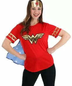 Your patriotic leotard and metal shin guards are great when you want to dress to impress, but somemes it’s nice to be able to save the world in comfort! This exclusive Women’s Wonder Woman Casual Costume makes a cute and easy costume, but it also is a fabulous way to infuse your everday wardrobe with some heroic flair. The bright red pullover T-shirt is made of comfortable polyester and features gold stripes and stars across the sleeves as well as a metallic gold Wonder Woman logo across the chest. The accompanying blue satin cape is accented with golden stars and attaches easily to the back of the shirt. The gold foam headpiece with its red star lets bad guys know even from a distance that it’s time to start running!Â