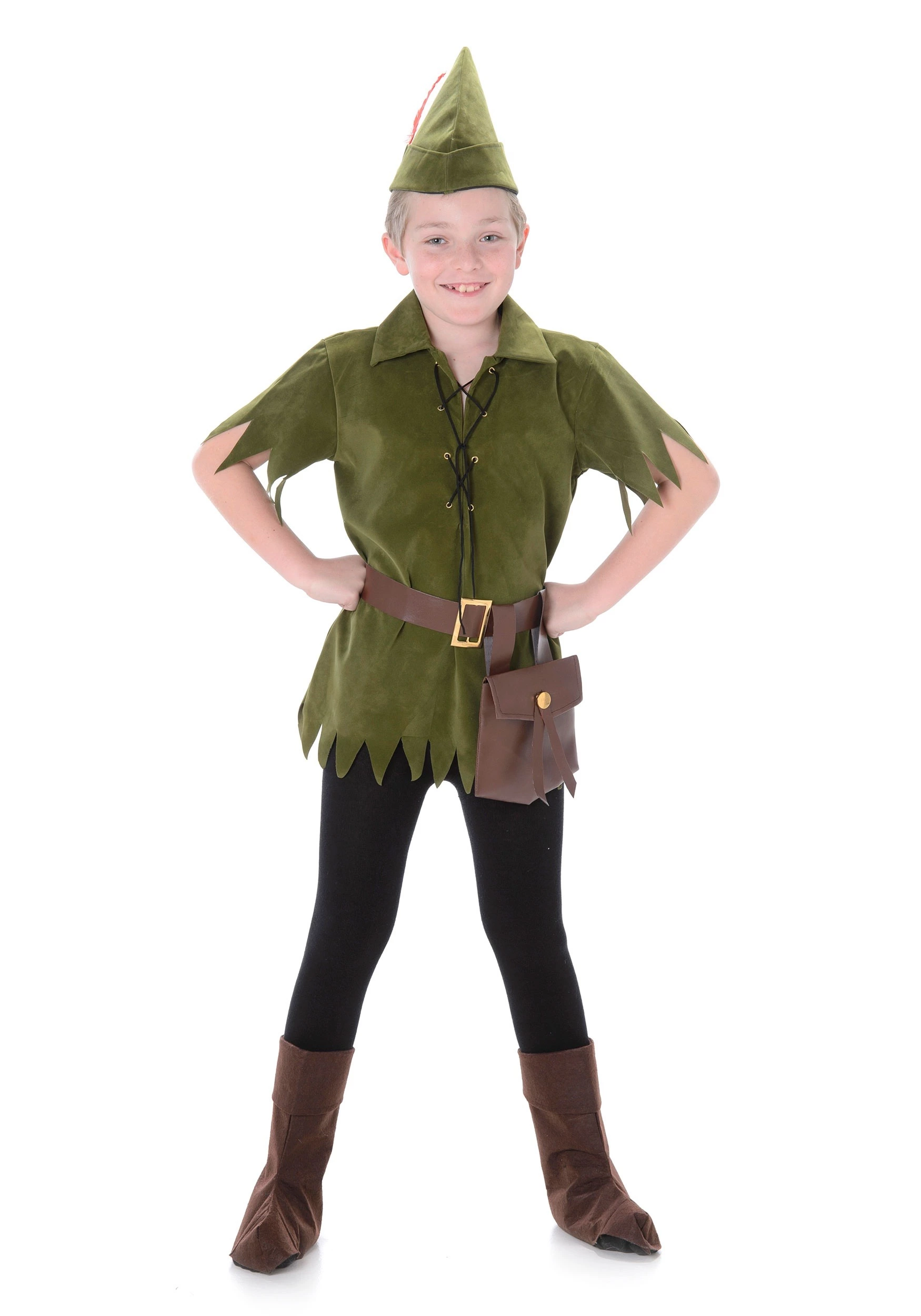 Pirates, fairies, wild adventure, a fearsome villain, and, oh yeah, all that flying! There’s a lot that can capture a kid’s imagination in Peter Pan. And the amazing thing is, the magic of such a big story can be conveyed in such a simple costume look. This outfit is comprised of Peter’s signature collared, green tunic, with a jagged hemline and sleeves. It has black cord lacing up the front, and gold rivet accents. A faux-leather, gold-buckled brown belt and hip pouch sit around the waist, and they match the calf-high boot toppers. Stick a (red) feather in his (green) cap—he’s ready to take on Hook and the other pirates with Peter’s classic pizzazz!
