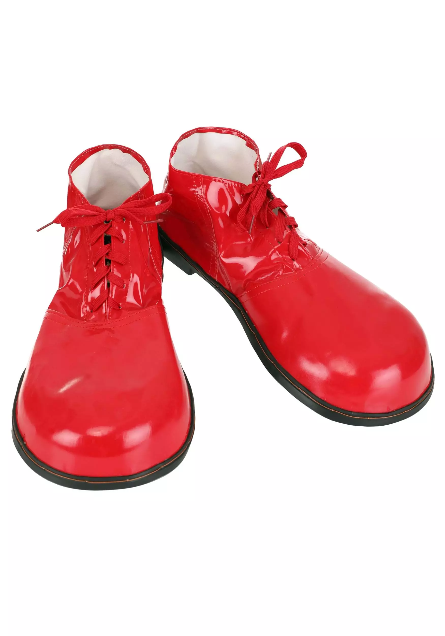 Make a silly or spooky impression in these Red Clown Costume Shoes! The circus-worthy footwear are made out of shiny red faux patent leather and black plastic soles. They feature oversized, rounded toes and lace up the front with red shoelaces.Â