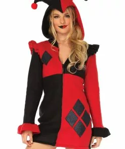 This costume is unbelievably cozy and a few extra accessories can really spruce it up. Pick up a pair of Harlequin red and black socks to make the fleece-fabric dress pop and wear a favorite pair of black heels. Finish up the look with a villainous makeup application and give a creepy grin.    Â