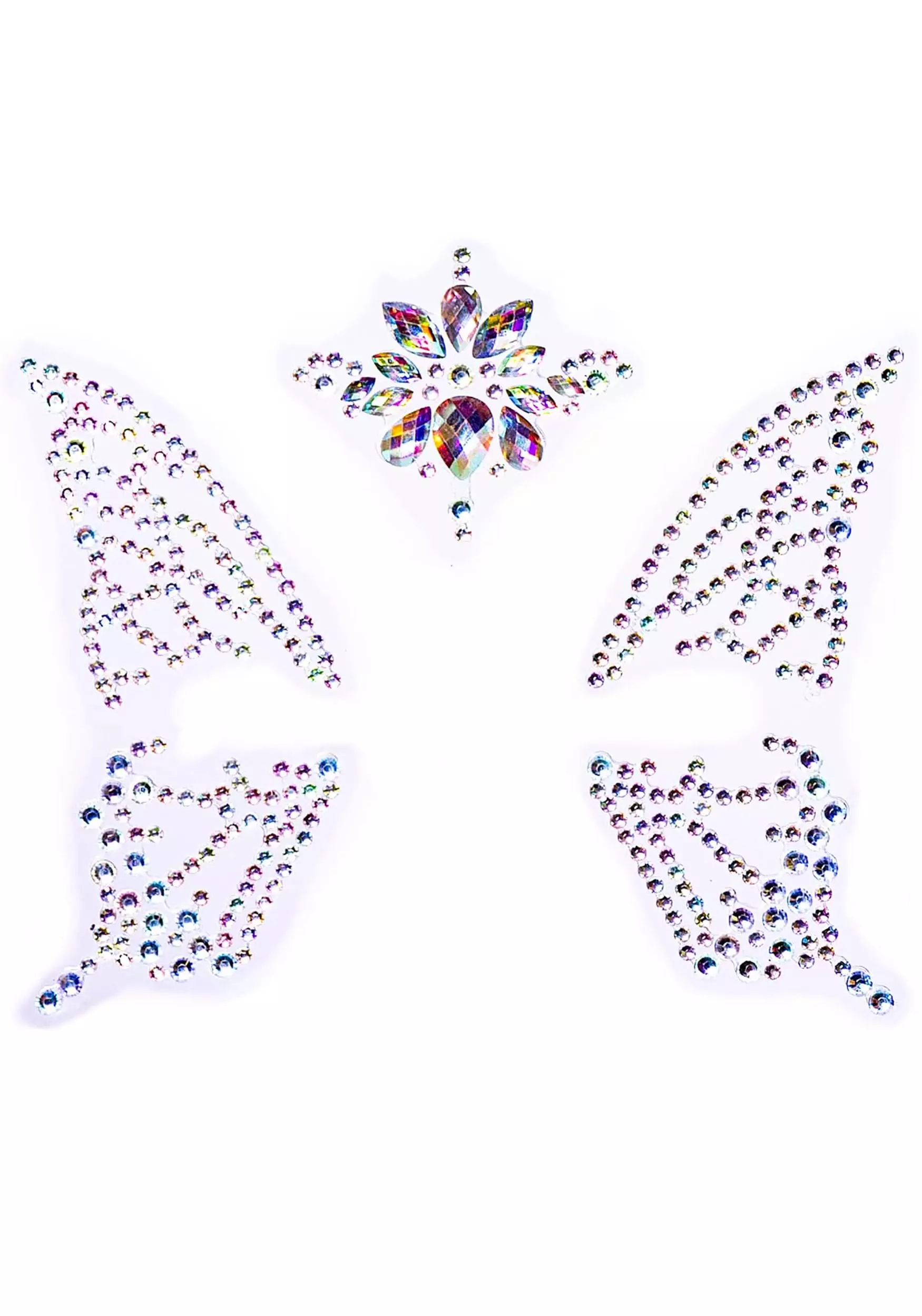 Your costume will take flight thanks to this Multicolored Fairy Face Jewel Kit! The set includes three separate pieces shaped like wings and a flower, and made of iridescent, rainbow-colored faux jewels. The patterns are attached to non-toxic adhesive backing. They’re easy to stick on and easy to remove when you’re finished with your magical look.Â