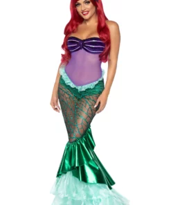 You just might be willing to give up your ability to ride a bike in order to look this stylish! This Women’s Under the Sea Mermaid Costume allows you to live like a real mermaid, at least for a night… minus the ability to breathe underwater, of course! The one-piece dress looks like a shell bra top and shimmery green tail, with light purple mesh over the stomach area. The “tail” part of the dress includes a solid green bottom piece, light green ruffles along the hips, and then see-through material that shows off your (rather human-looking) legs and is covered in scaly green patterns. At the bottom, it’s edged with metallic green and sea foam ruffles. The dress is held up with clear straps, and the costume also comes with a starfish hairclip.