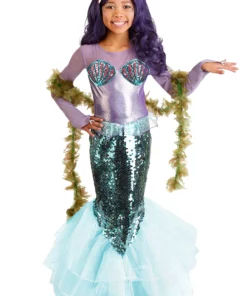 It’s easy for others to believe your kiddo’s mermaid origins when she shows up to costumed events in this sparkly ensemble. Designed by our mermaid-loving creative team, this exclusive dress has a shimmery opaque mid-drift and sequined shells making up the bodice. lightweight purple material creates a fashionable illusion neckline as well as long sleeves that slip over the middle finger for a princess cut. The mermaid tail is rich with scale-shaped sequins while tulle flares out in gorgeous tiers to create the fins. Secured with hook and loop fastener strips down the back, diving into this mermaid look is a breeze!
