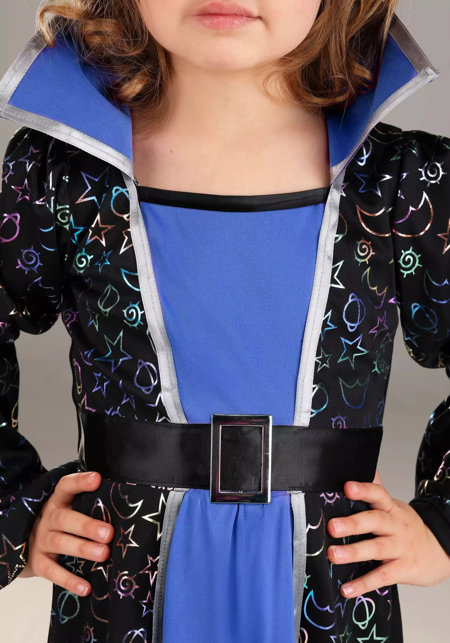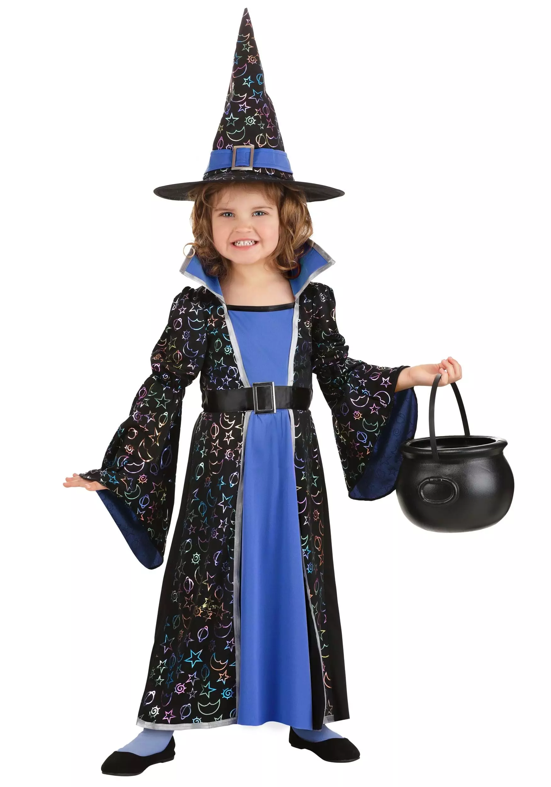 Your little spellcaster will look spellbinding when wearing her exclusive Celestial Toddler Witch Costume! The outfit includes a gown that’s designed to look like a long coat belted around a same-length dress. The bell sleeves, outer bodice, and overskirt are made of black fabric that’s printed with metallic images of moons and stars. The bodice and skirt inset are both made of heavenly blue material. A high collar frames your toddler’s face, and a wide black belt fastens around her waist. The metallic-printed witch hat features a blue band decorated with a silver-tone buckle!Â