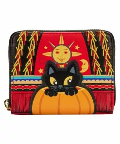 Relive the story of the Sanderson sisters with this officially licensed Loungefly Disney Hocus Pocus Dani Binx Ziparound Wallet! The front of the faux-leather wallet is printed with colorful graphics of a cartoon-esque Binx peeking out of a pumpkin against a backdrop reminiscent of Dani’s Halloween costume.Â