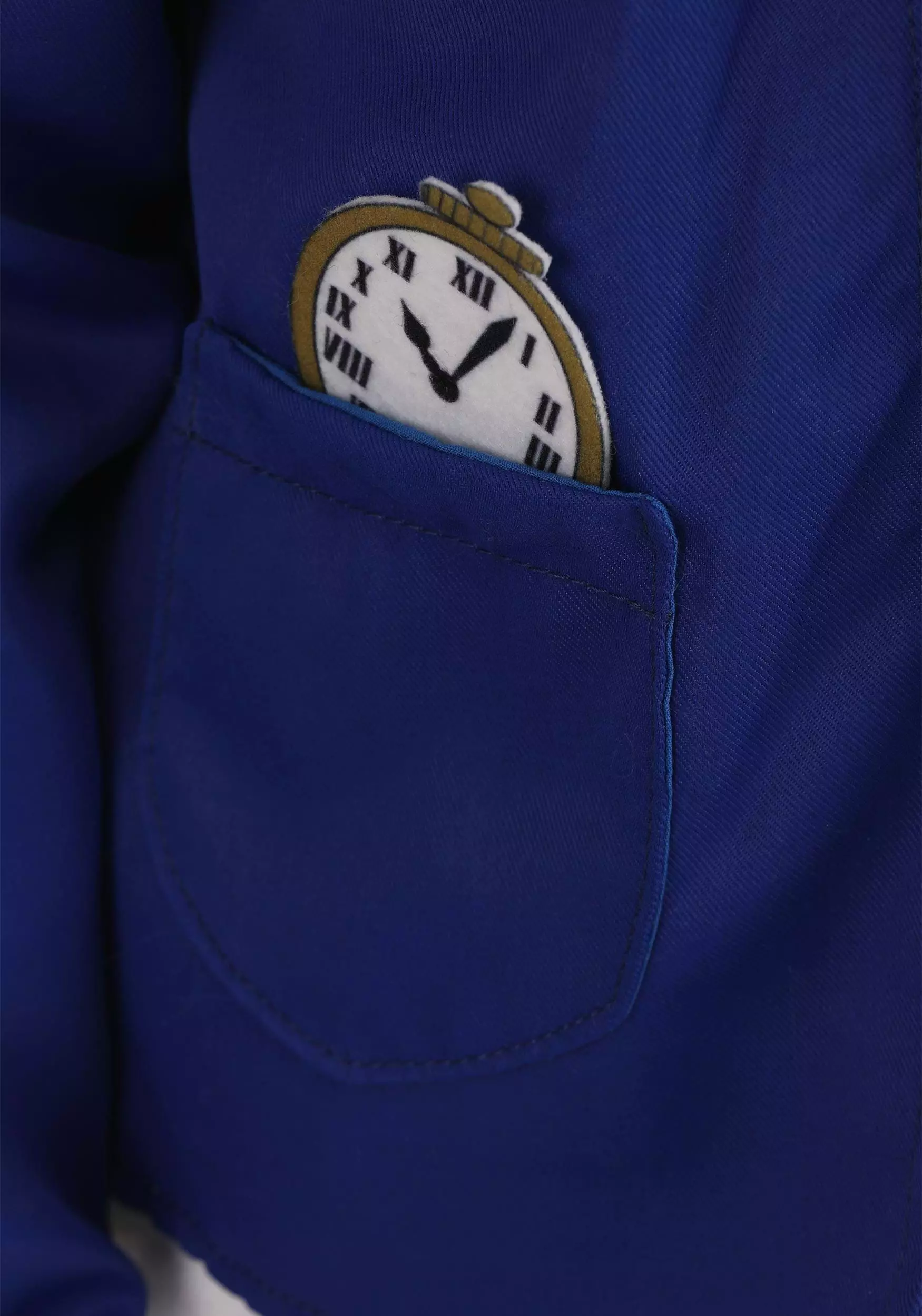 - Jacket has front pocket w/ printed felt pocket watch peeking out