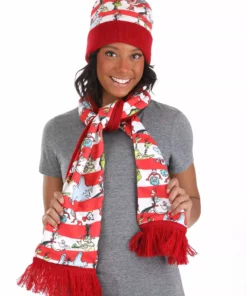 Even freezing weather feels more fun when you wear your exclusive, officially licensed Dr. Seuss Winter Hat & Scarf Kit! The red and white knit scarf is printed all over with Dr. Seuss characters, including the Cat in the Hat, Horton the Elephant, the Grinch, and more! Red and white fringe decorates each end. The matching hat has a thick red brim and is topped with a red and white pom pom.Â