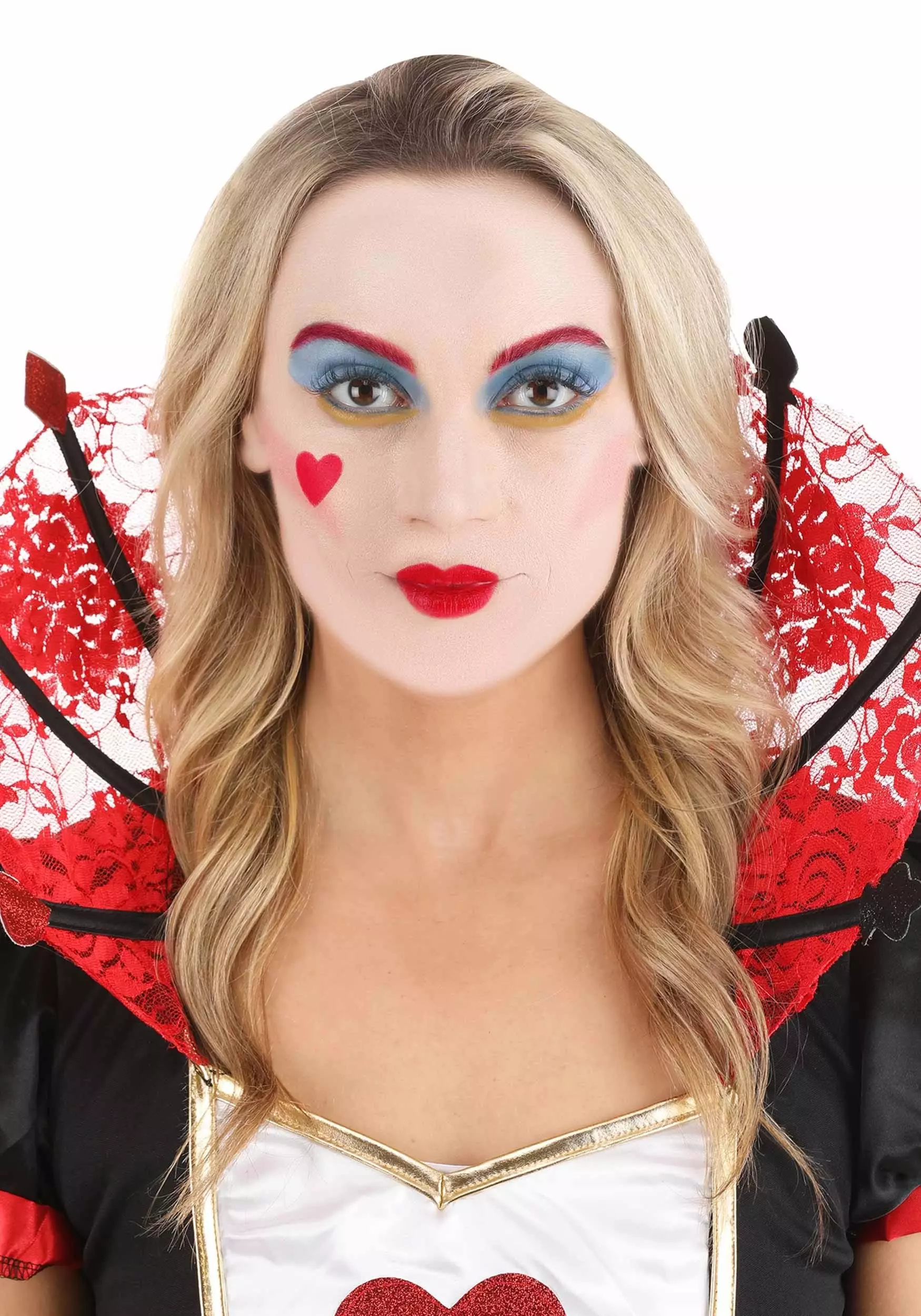 Steal every heart when you use this exclusive Queen of Hearts Costume Makeup Kit! The plastic makeup palette includes non-toxic makeup in shades of crimson, bright blue, white, and yellow so that you can transform yourself into the ruler of a magical, upside-down land. The included foam-tipped applicator assists an even application. When you’re finished with your look, remove the makeup by following the directions printed on the package.Â