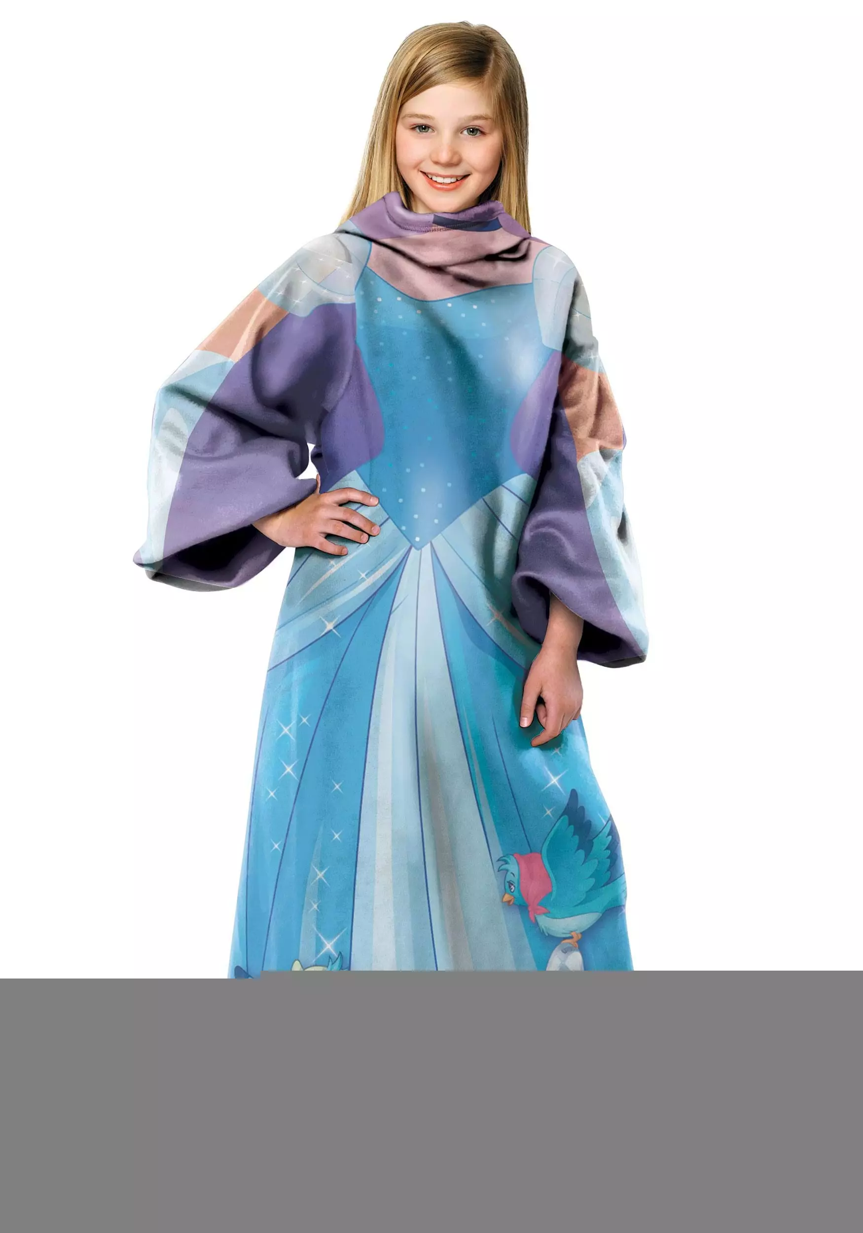 Get your child ready for their next slumber party with this Cinderella Youth Comfy Throw. Wrapped in this dress-shaped blanket, they’ll look as spectacular as Cinderella in her iconic, glittering ballgown! Unlike her magical look though, this 48-inch by 48-inch blanket is sure to fit them for more than one night. Should the fun get rowdy and favorite drinks or snacks get spilled, Fairy Godmother won’t need to conjure up a replacement; this machine-washable blanket is up for the mess! So, whether they’re snuggling up at home to re-watch the Disney classics or joining their friends for a fun-filled night, this super-soft, officially licensed blanket has them covered!