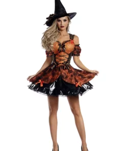 This Harvest Witch costume is plenty of fun. It features a party-ready mini dress that’s rich with cheerful Halloween details. The top has a faux corset design with a candy corn scatter pattern fabric framing a sparkly orange center panel and structured cups. The off-shoulder sleeves are tied into the rest of the costume with black lace and satin bows. A layer of sparkly spiderweb fabric layered over a wet-look material creates a skirt with a magical spin-factor! Topped off with a conical hat that’s decorated with a candy corn bow and a long spiderweb drape, this magical ensemble will set the scene as soon as you walk into the room!