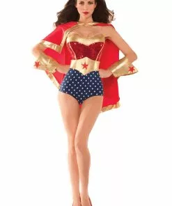 Feel the power when you’re rocking this Wonderful Babe Costume! The retro color scheme and romper style will make you feel like you’re stepping out of a comic book in the most stylish way. The stretchy one-piece romper has a subtle sweetheart neckline and high-waisted starry briefs. Sequins back the top really pop! This look is topped with a red and gold cape as well as golden gauntlets and a crown.Â