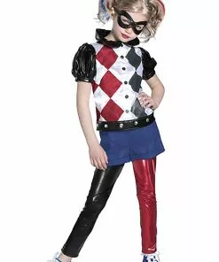 This DC Super Hero Girls Harley Quinn costume is a premium costume for kids. It comes with a white shirt with repeating black and red diamonds on the front. The diamonds even have glitter on the front for an eye-catching style worthy of the cute class clown. The buttons on front are decorative and actually is a pull-over style shirt. The dark blue shorts fit with elastic in the waist and the leggings provide a bright pop of color with their black and red colors. The finishing touch to the outfit is the black mask, which will transform your child into Super Hero High School’s infamous joker!