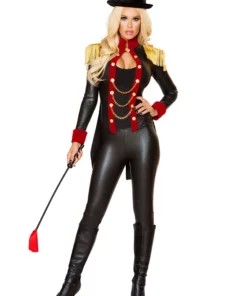 This catsuit is ready for showtime with sassy coattails attached to the back. The sleeves are detailed with gold tassels over the shoulders and red cuffs at the wrists. The front panel is accented with a red fabric border and gold buttons on each side with chains connecting them. Polish your look with the included top hat, find the whip of your choice, and your look will be complete.Â