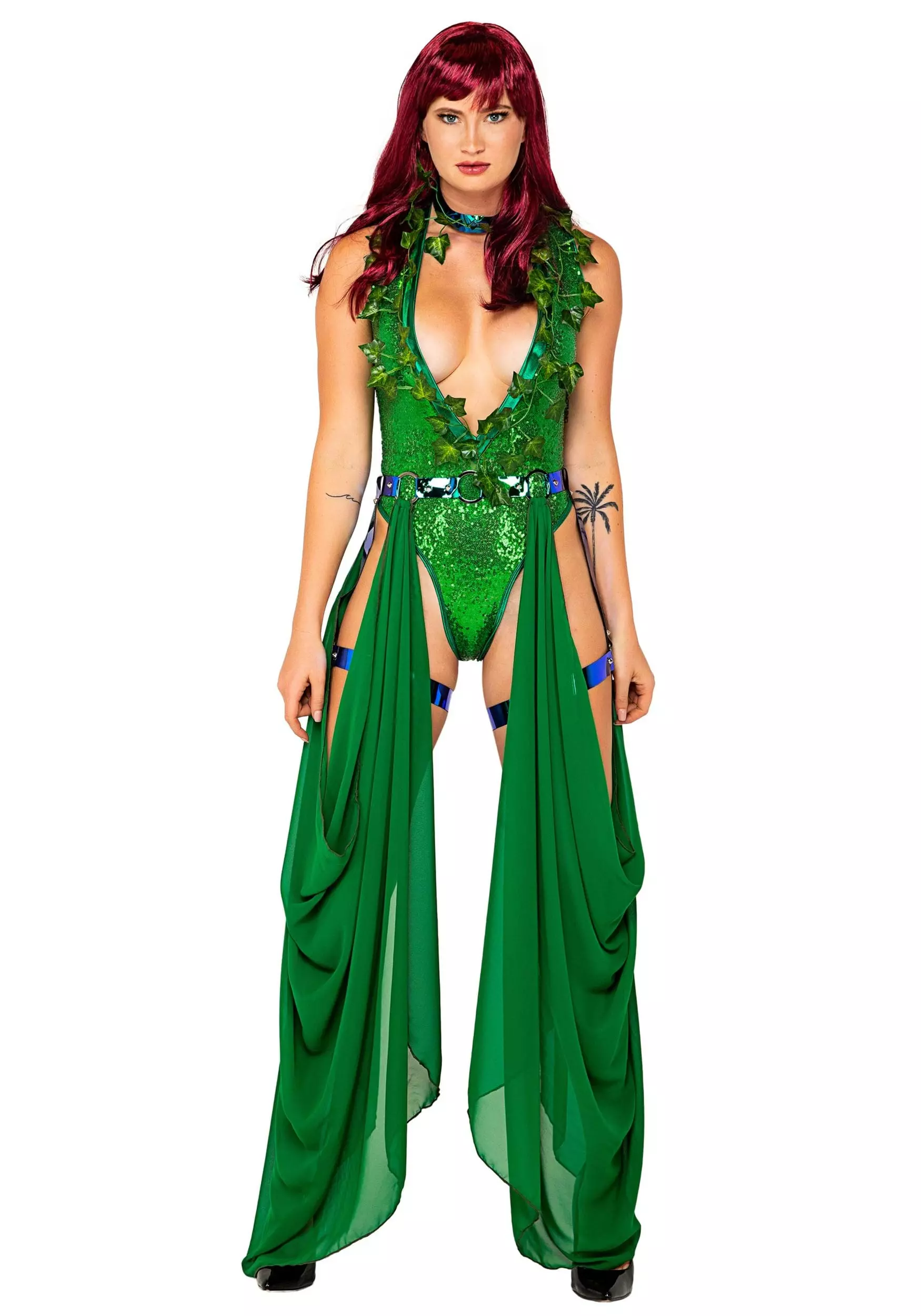 You’ll be ready to show the world your power when you put on this Sexy Poisonous Kiss Costume! The ensemble starts with a sequin-adorned green bodysuit that features complementary trim. Artificial vines encircle the plunging neckline. The shiny blue garter belt has attached draped green panels for extra flair, and the blue choker completes the costume.