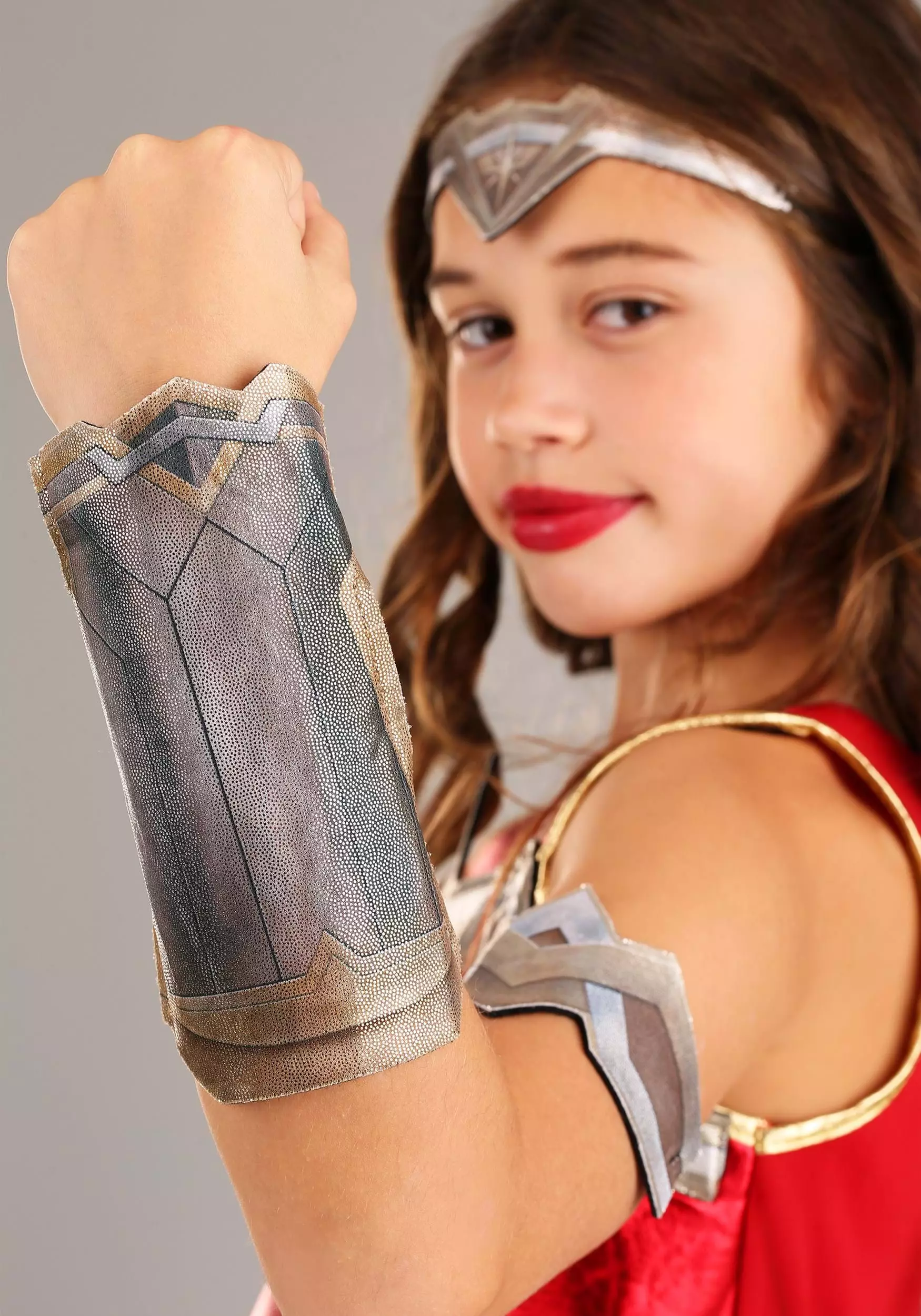This girl’s superhero costume starts with a red, blue, and silver dress that recreates the style worn by Wonder Woman in the movie. The top of the dress is made out of shiny red foam and has a silver accent on the top. The skirt of the dress is a jersey knit material and has shimmering blue fabric in the back. The foam belt has a “W” shape in the front and it fits with a fastener. The boot tops fit over most pairs of shoes and the matching gauntlets fit around your child’s wrists. Finally, the costume comes with a headpiece, which fits around your child’s head with an elastic band. It all comes together for a look that’s perfect for any young hero!