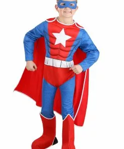 Choose your own superhero adventure when you wear this exclusive Kid’s Muscle Suit Superhero Costume! The jumpsuit fastens down the back and is made of comfortable and breathable red, blue and white jersey-knit polyester fabric. The top is printed with a five-pointed white star, and the chest and sleeves are stuffed with fiberfill to give it a muscular appearance. A red twill cape attaches to the jumpsuit’s shoulders. Foam-backed red boot covers secure under each foot with attached elastic bands. Hide your secret identity behind the blue foam face mask!Â