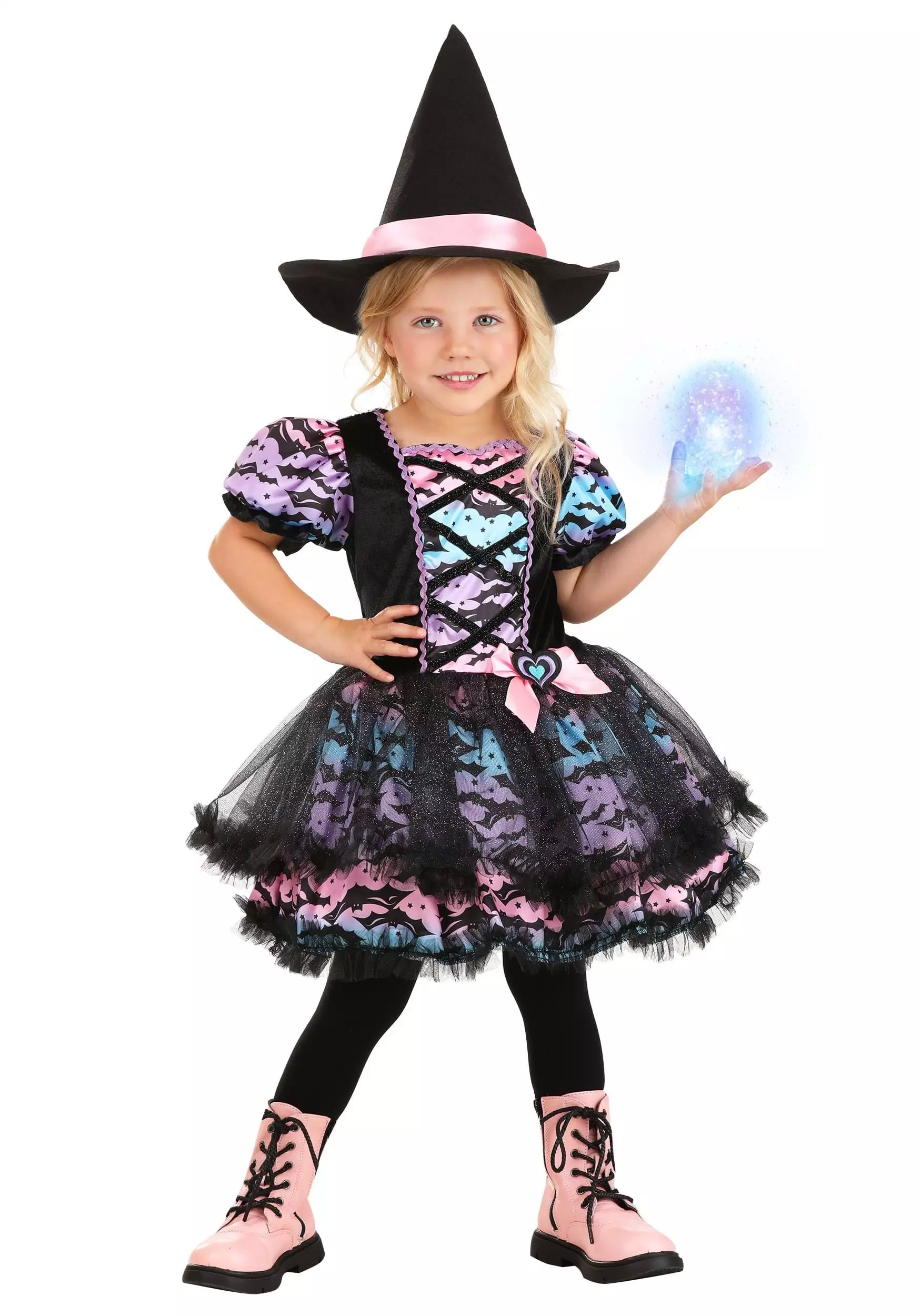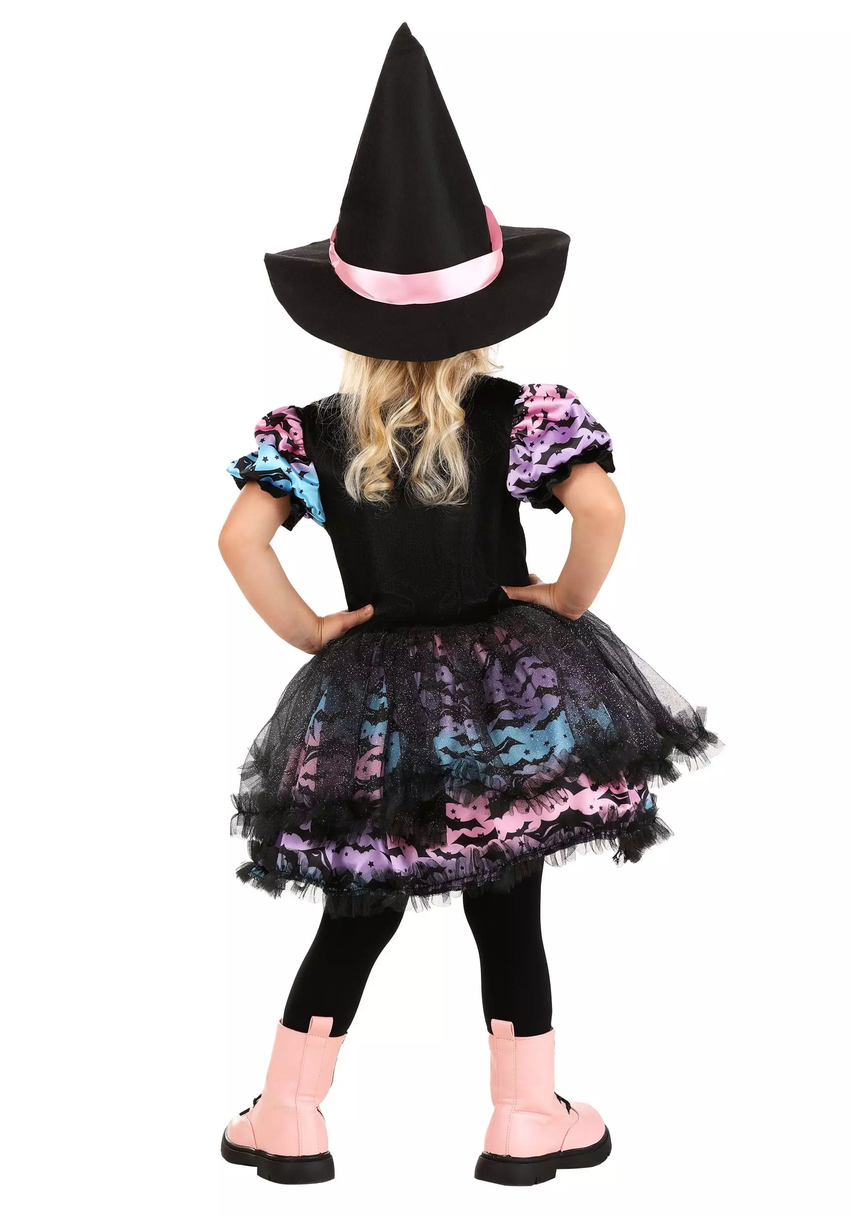 Your toddler will look absolutely spellbinding in this exclusive Pastel Tutu Toddler Witch Costume for Girls! The sweet and stylish dress is made of pretty fabric printed with a pattern of flying black bats on a pale pink, purple, and blue background. The top has black bodice details with criss-crossed ribbon, and a pink bow is sewn to the waistline. The tutu-style skirt has an underlayer of bat fabric trimmed in ruffles, and is topped with a layer of glittery black mesh. The matching black felt hat is decorated with a wide pink ribbon.Â