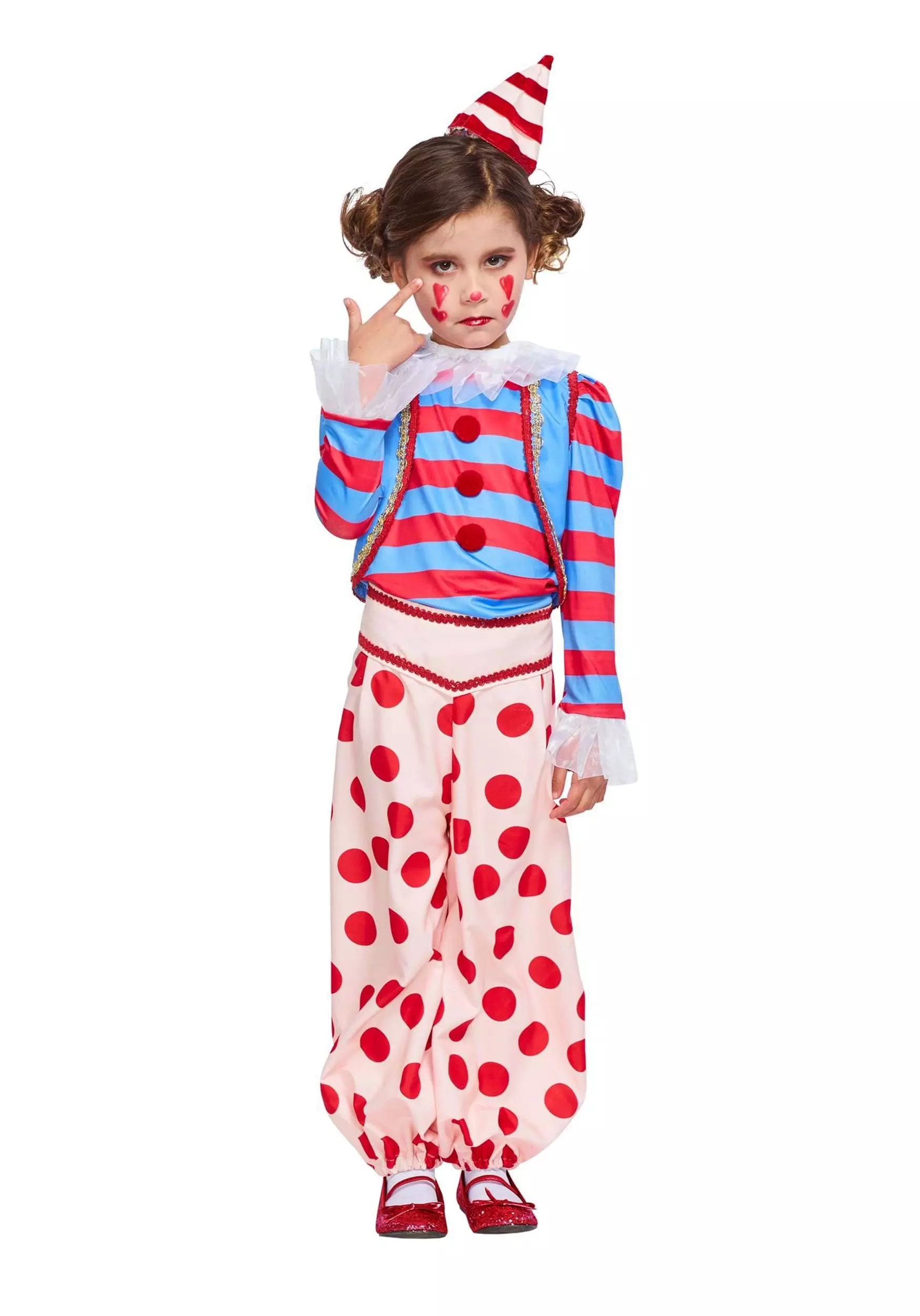 Get ready to hear wild applause when you wear your Vintage Clown Costume for Girls! The polyester pullover shirt is printed with blue and red stripes and sewn with pleated white organdy at the neckline and sleeves. The blue vest is trimmed with gold and red braid. The polka-dotted pants have gently puffed lower legs and are also decorated with red braid. Once you slip on the cone-shaped, striped hat, you’re ready to start your act!Â