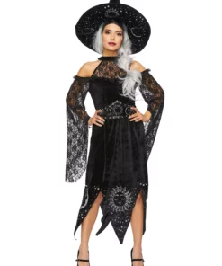 Dazzle and delight in this Women’s Black Mystic Witch Costume! The outfit includes a gorgeous velvet dress that features an illusion-style neckline made of flower-patterned lace that matches the bell-shaped, cold-shoulder-style sleeves. The skirt’s long zig-zag points are decorated with mystical symbols of suns, stars, and moons. The velvet belt is embellished with more celestial symbols and edged with faux leather. Top it all off with the tall, pointed witch hat that’s backed with foam and printed with stars, moons, and suns on the underside of its wide brim.Â