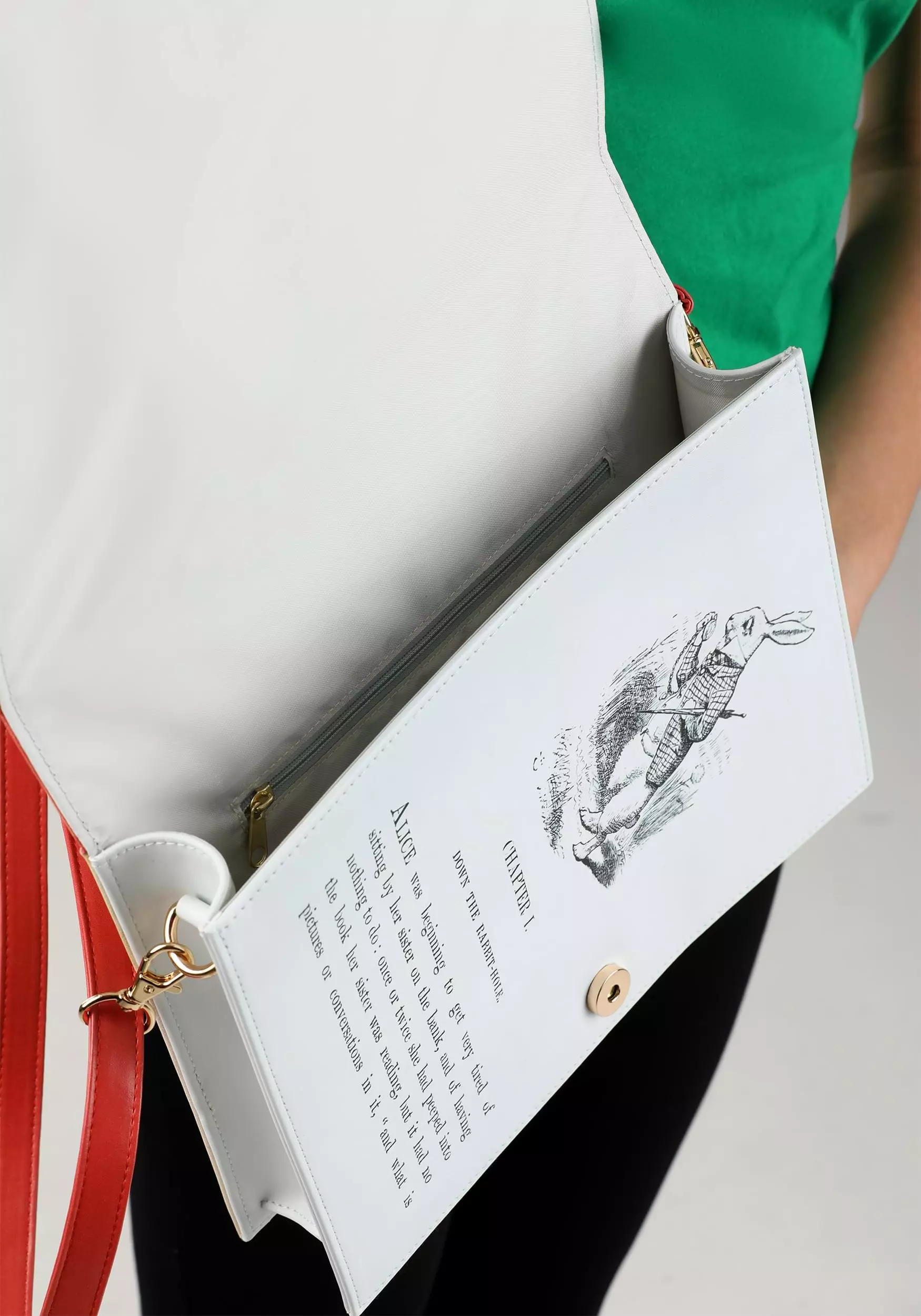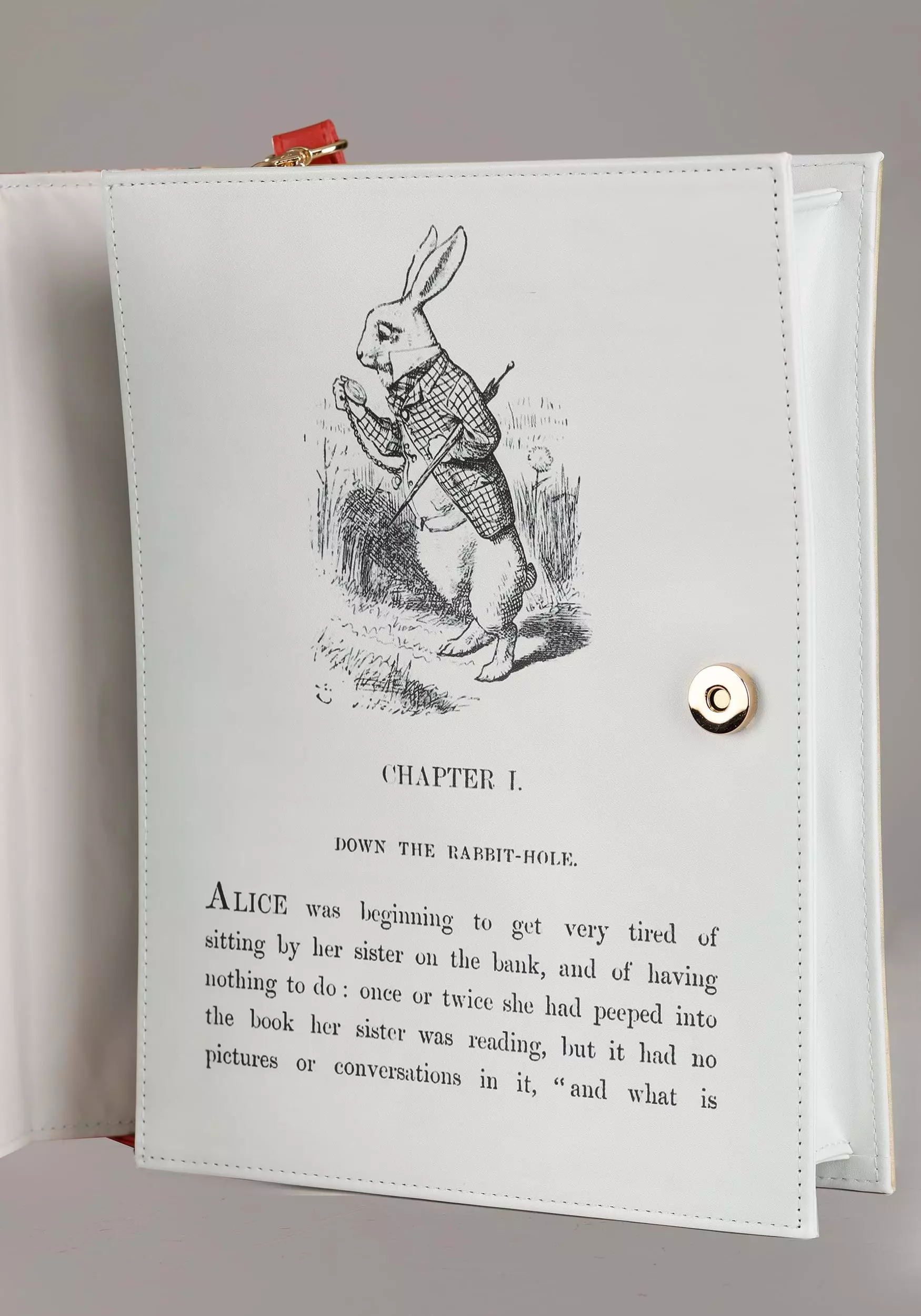 Fall down the rabbit hole to a fashion wonderland when you carry this Alice in Wonderland Book Purse! The rectangular bag is printed with a vintage cover of Lewis Carroll’s most famous work and comes with an adjustable red crossbody strap. Unfasten the purse flap’s magnetic clasp to reveal a printed image of the book’s first page!Â