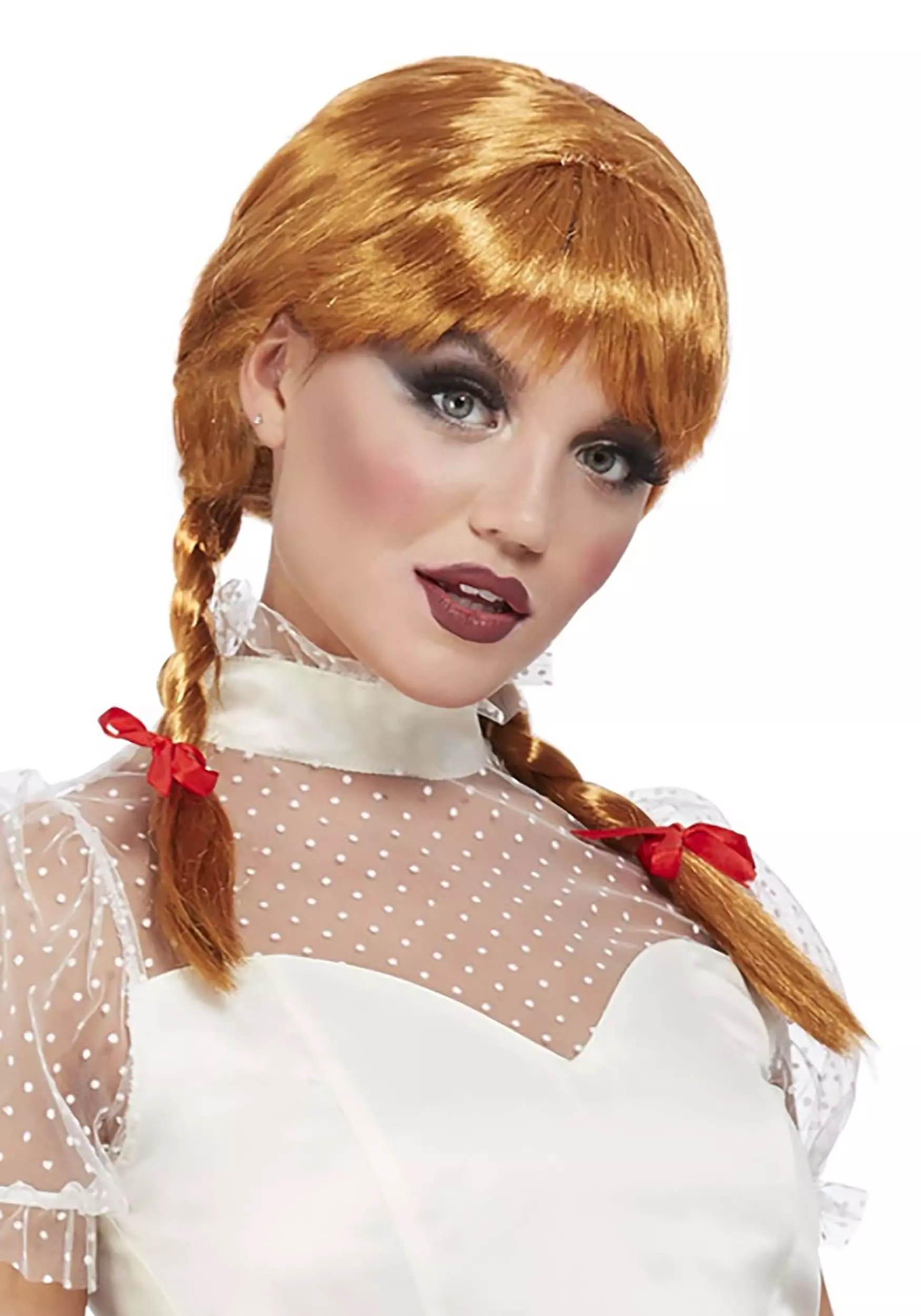 Long story short, don’t hassle with tying your hair back into those braids. Make sure your haunted doll costume looks perfect and is trauma-free with this Auburn Porcelain Doll Wig. This 100% synthetic hair wig is designed with face-framing bangs and two 18-inch braids with red bows at their ends. The interior wig cap features elastic to provide a more secure fit on the one-size-fits-most accessory.