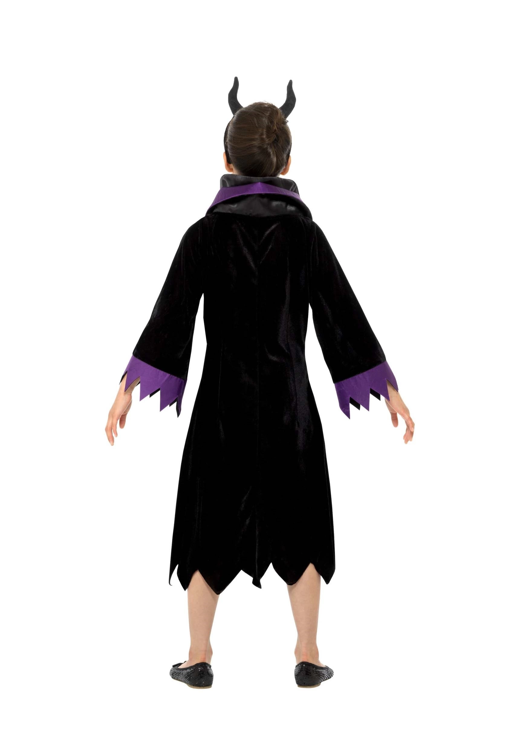 This costume veils future queen in a long robe-like dress with tattered sleeves and hemline. The pullover-style dress is made from ultra-black, soft and velvet-like fabric creating a luxurious yet leery appearance that says, “I’m probably up to no good.” A satin royal purple stripe is directly down the middle as well as around the sleeve cuffs and the collar. Finally, a headband featuring plush black horns is also included with this costume.Â