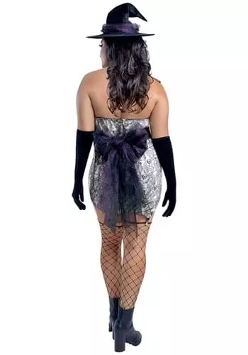 This Plus Size Gothic Elegance Witch Costume for Women is a little bit magical, a little bit high fashion, and is a whole lot of fun to wear! The stretchy spandex minidress is printed with a vintage pattern and has a mesh halter-style neckline sewn with a black velour bow. The bodice is embellished with a lace-up inset and the glittery organza belt can be tied around the waist as desired. A pair of long velour gloves matches the velour witch hat with its glittery tulle. Four garter clips are sewn to the front and back of the dress’s hemline so that you can wear the outfit with your favorite pair of stockings.Â