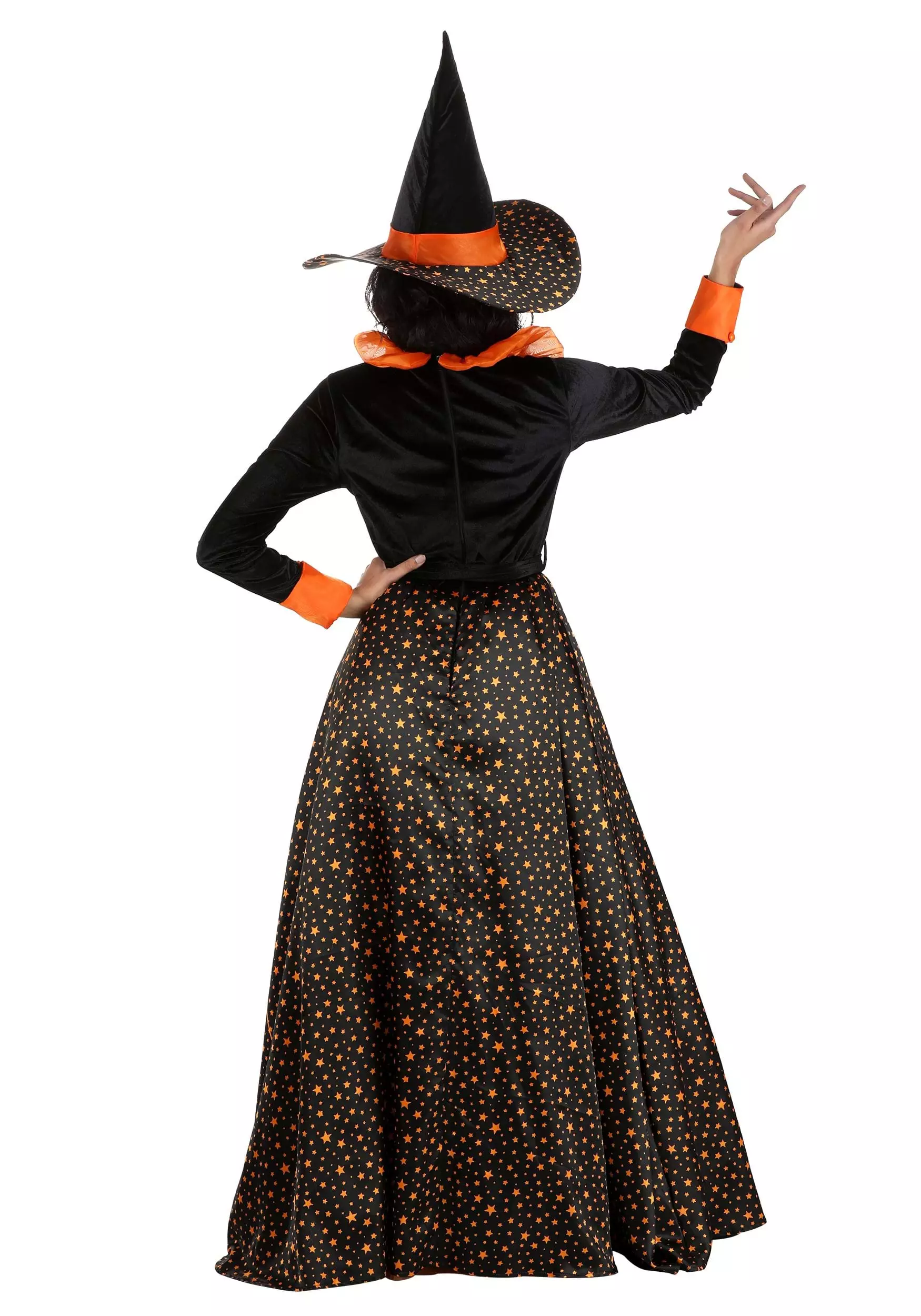 Dazzle all of Salem when you wear your exclusive Adult Sparkling Orange Witch Costume! The sweeping gown has a bodice and sleeves made out of midnight-black velour. It’s decorated with a row of orange buttons, orange cuffs, and a ruffled orange organza collar. A wide black belt cinches around your waist with a silver-tone buckle. The star-printed overskirt is slit down the middle so that the pumpkin-colored tulle petticoat can show. Top it all off with the pointed velour witch hat!Â