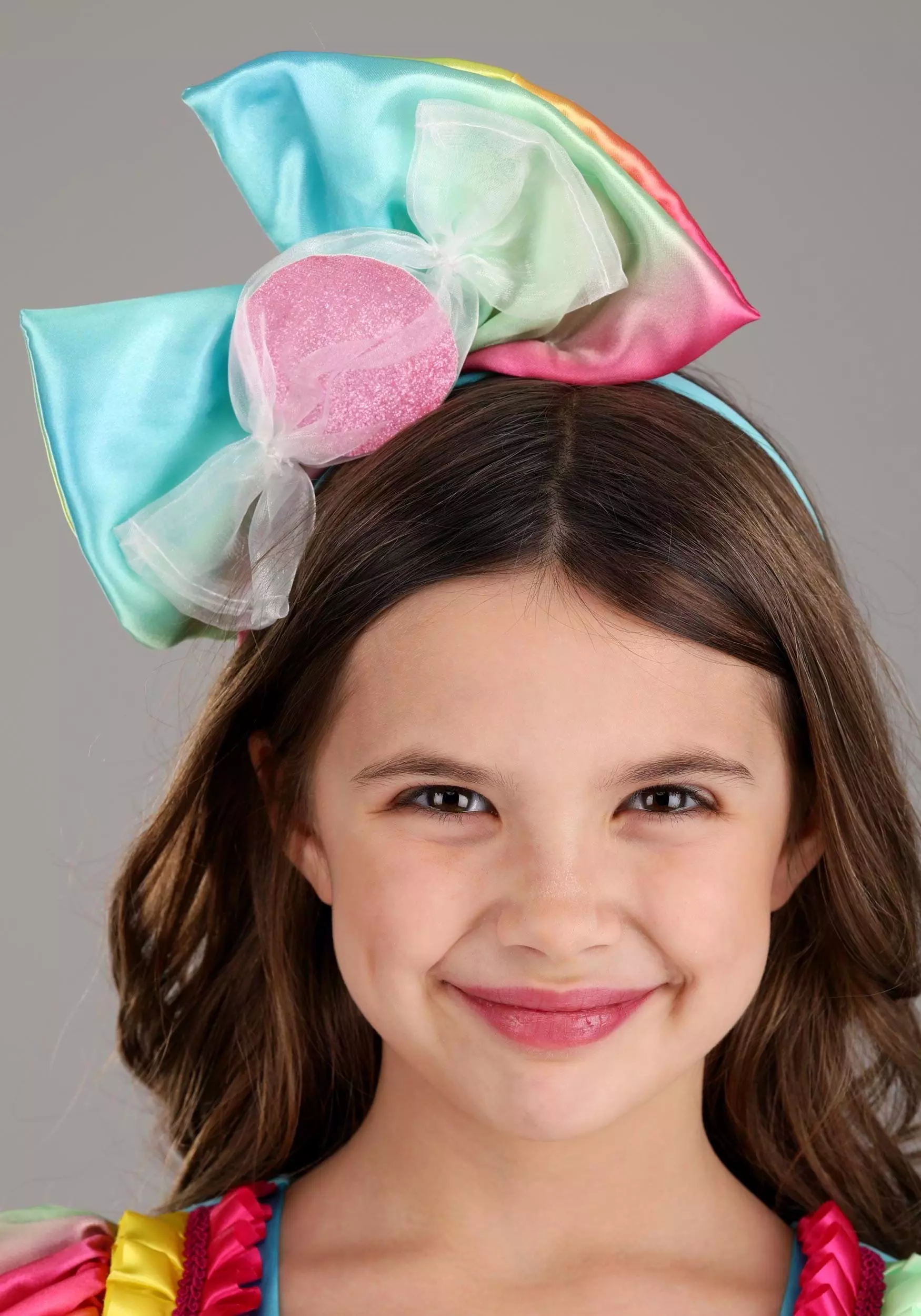 - Fabric covered plastic headband has large satin bow anchored by an organdy-wrapped “candy”