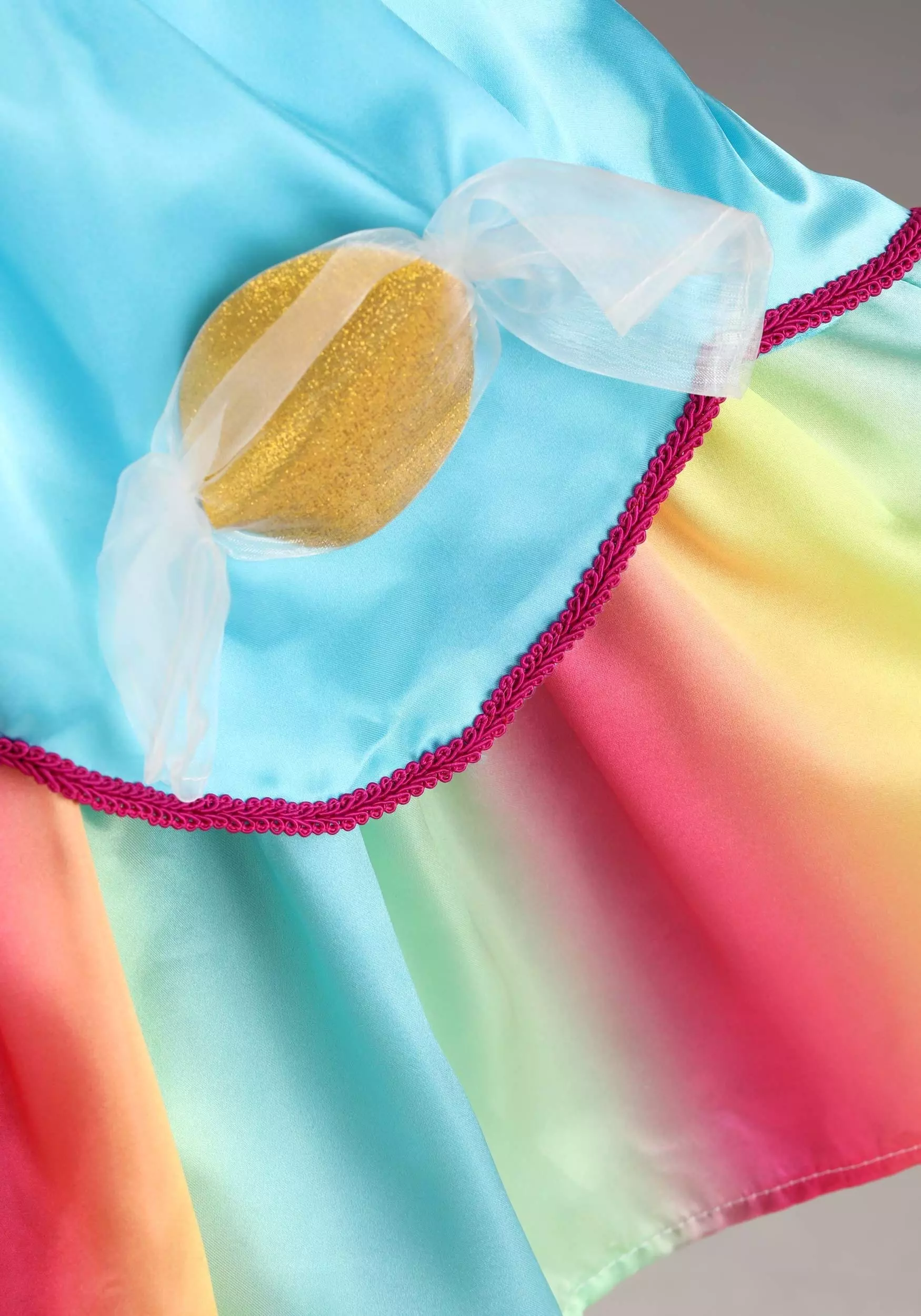 - Bodice is trimmed w/ deep pink braid, glittery circles wrapped in organdy to look like cellophane-wrapped hard candies