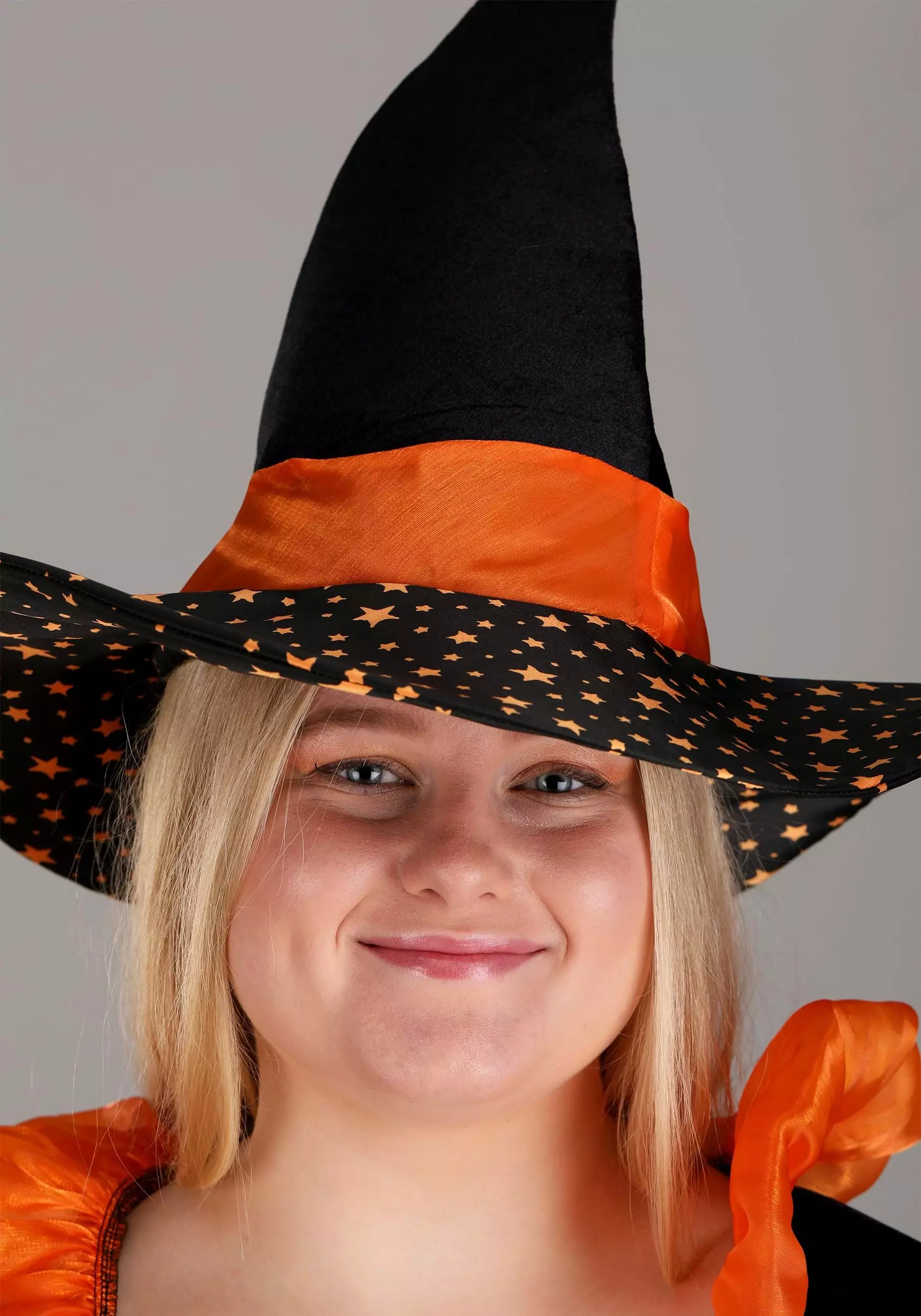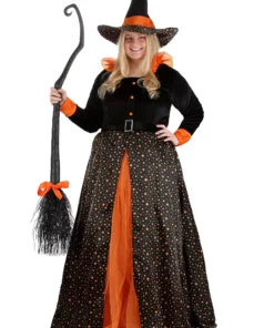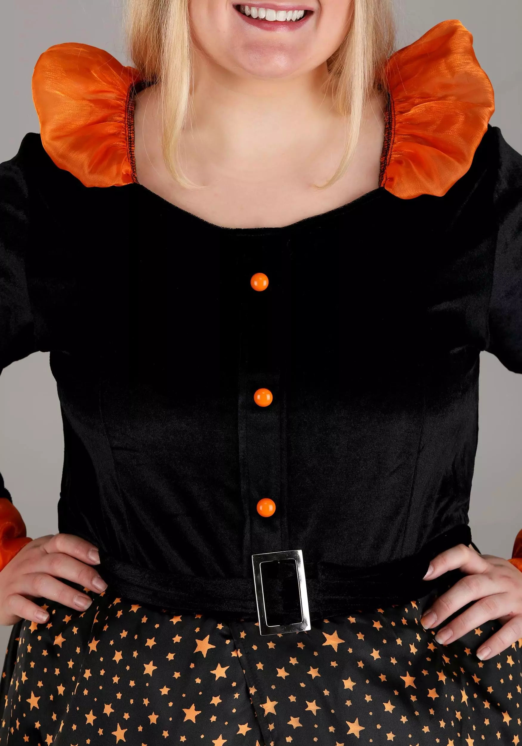 You’ll be the undisputed winner of Halloween outfits when you wear your exclusive Plus Size Sparkling Orange Witch Costume for Women! The lovely floor-length gown features a princess-cut bodice made of black velour with matching long sleeves. A column of orange buttons decorates the front above the velour belt. The sweeping skirt is made of star-printed black satin and is slit up the front to reveal a built-in orange tulle petticoat. The pointed black velour witch hat is backed with foam and circled with a wide orange ribbon band.Â