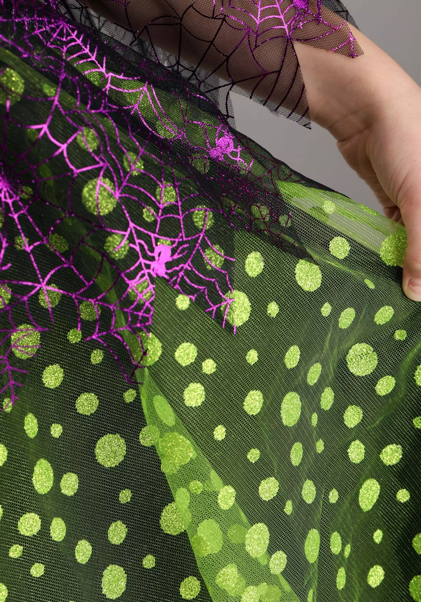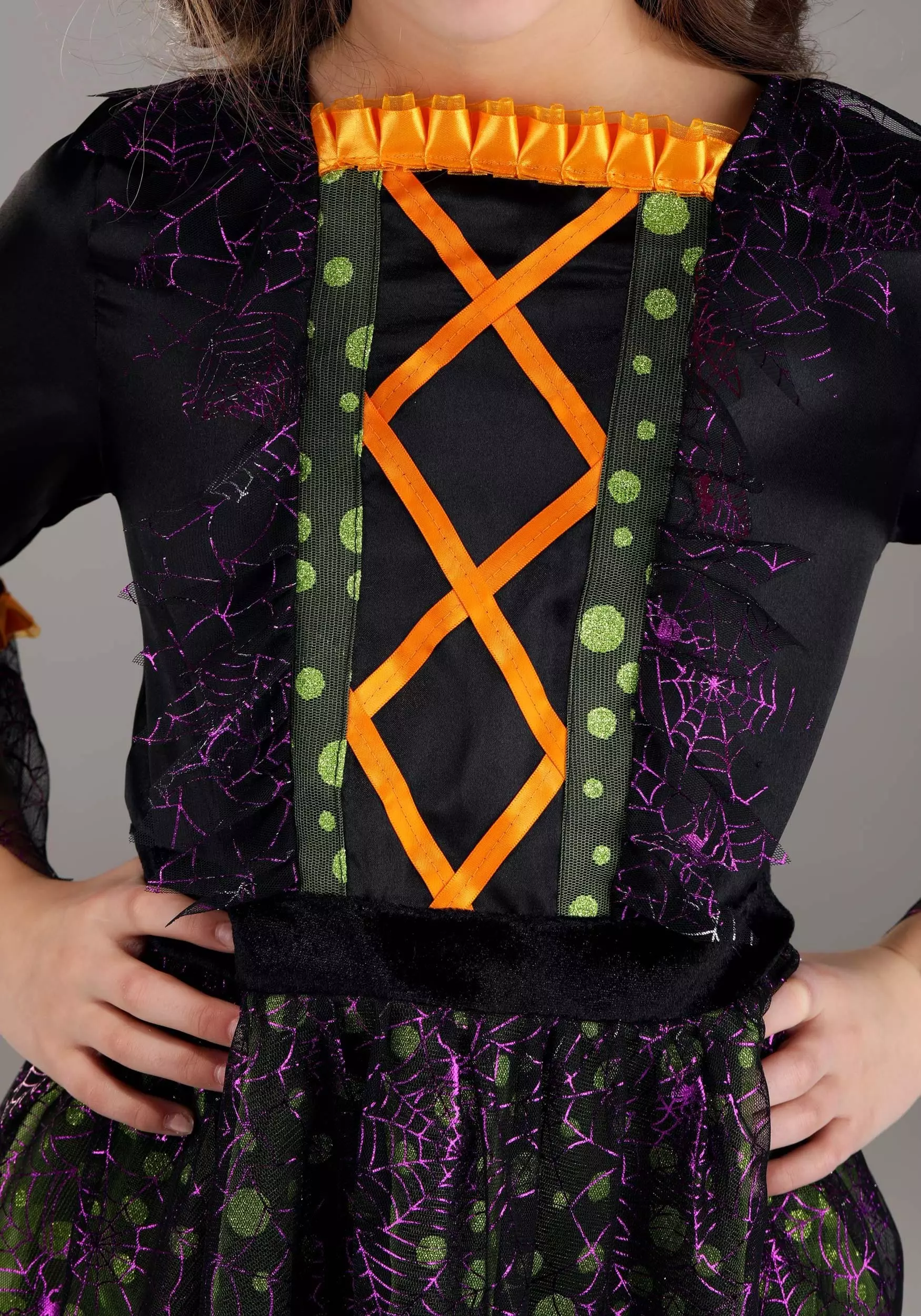 The power of a perfect costume is at your fingertips when you wear your exclusive Verdant Spring Witch Costume for Girls! The outfit’s dress zips up the back and features a black satin bodice with three-quarter-length sleeves decorated with spiderwebby mesh trim. Orange ribbon criss-crosses the bodice, and the high-low skirt features layers of purple and green mesh over a base layer of black satin. The orange-and-black leggings complement the curl-tip witch hat with its wide brim and green trim.