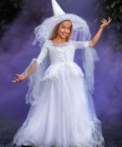 Cast your spell in this exclusive White Witch Kid’s Costume! The gorgeous gown would be right at home at a ball as well as on a broomstick. The swishy, floor-length skirt has layers of sheer fabric to make it seem as though you’re floating through a cloud. The velvety bodice splits down the front, with long, ruffled, lace-trimmed sections below the waist in the front and back, and fastens with lace-up ribbon detail. More lace decorates the neckline and gauzy fabric dangles from the elbow-length sleeves for a bell sleeve effect. The tall white witch’s hat has a wide brim adorned with more sheer fabric like a lovely veil, wafting behind you as you move.Â