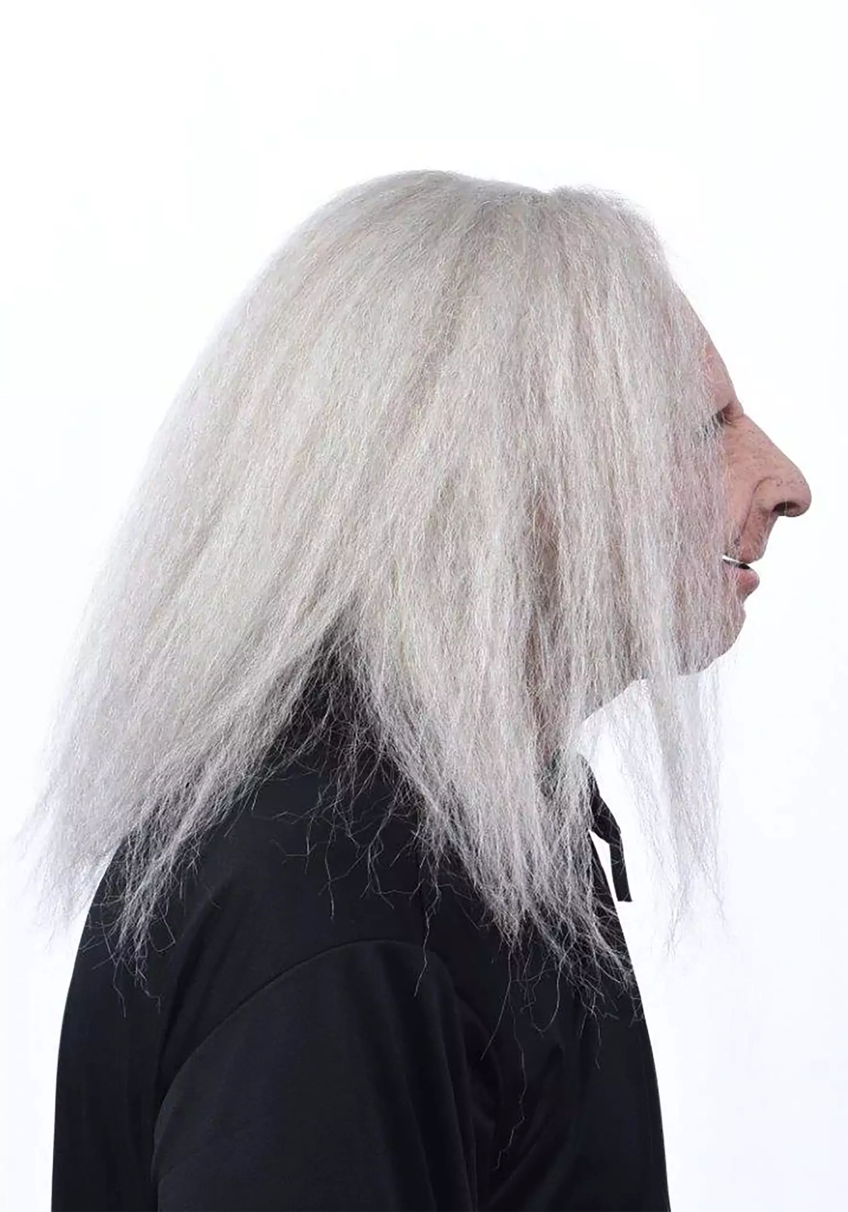 Act your age in this Old Lady Florence Wig! The molded latex mask is attached to a shoulder-length wig of light grey synthetic hair styled in a center part. The mask itself is painted and styled realistically with plenty of wrinkles, a mouth that’s twisted upward in a half-smile, half-sneer, and eye holes so that you can see where you’re going.Â