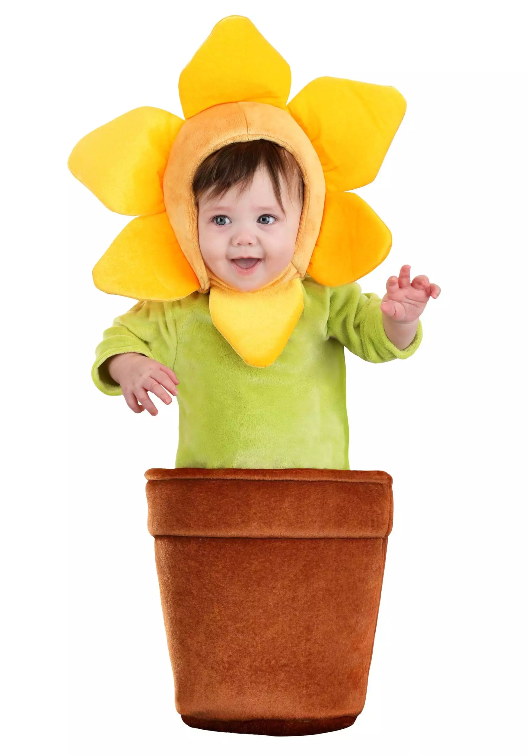Your little sprout will shine in an exclusive Flower Pot Bunting Infant Costume! The outfit is made from cozy polyester velour and features a bright green top with long sleeves. A velour bottom shaped like a planter is sewn to the hem of the shirt and is backed with foam to help it keep its rounded shape. The included headpiece fastens under the chin. Its orange velour hood is surrounded by oversized yellow velour flower petals. Your baby’s face will peek out from the middle like the cutest plant in the world!Â