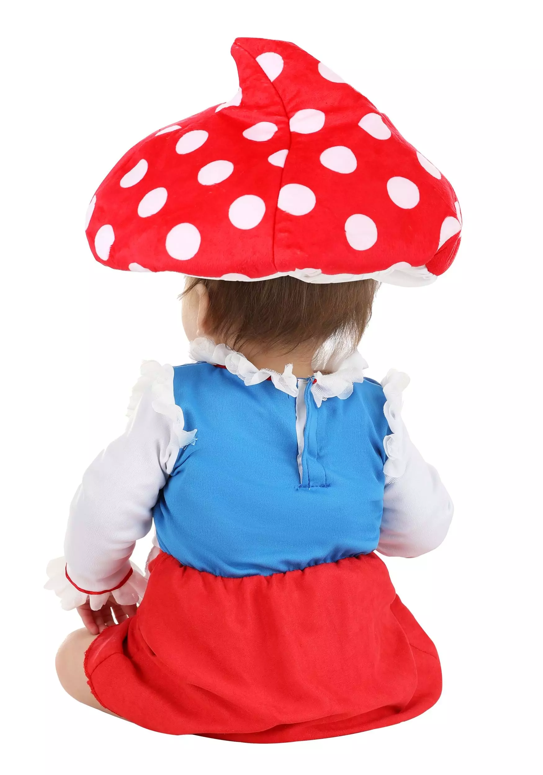 Your child will look like she stepped out of the pages of a fairy tale when you dress her in this exclusive Gentle-Hearted Garden Gnome Infant Costume! The one-piece jersey knit dress fastens at the back and is designed to look like three separate articles of clothing. The top is printed to resemble a white blouse worn under a deep blue bodice printed with faux stitchwork and lacing. The red skirt features an attached apron panel decorated with a printed red and white mushroom. The foam-backed hat is shaped like a red mushroom cap and printed with polka dots.Â