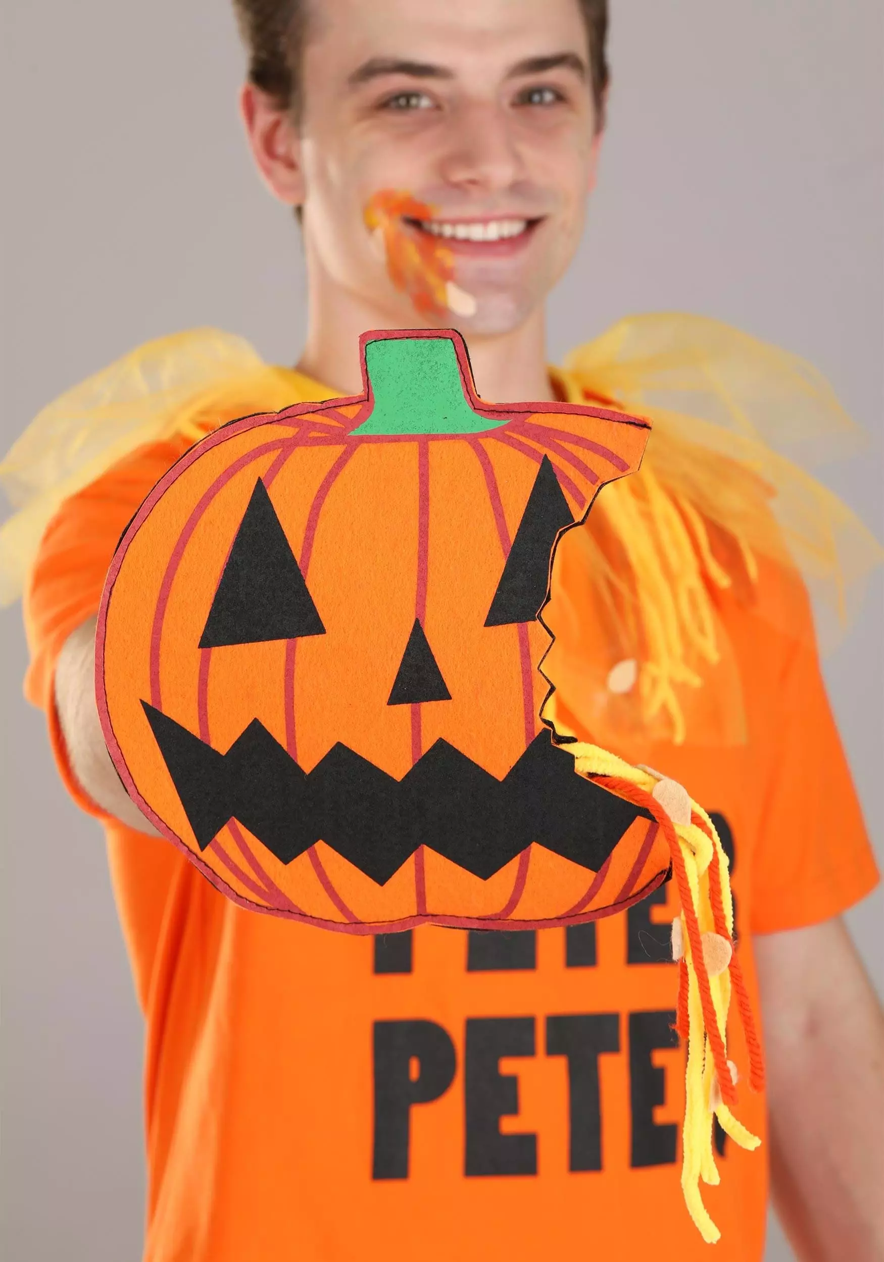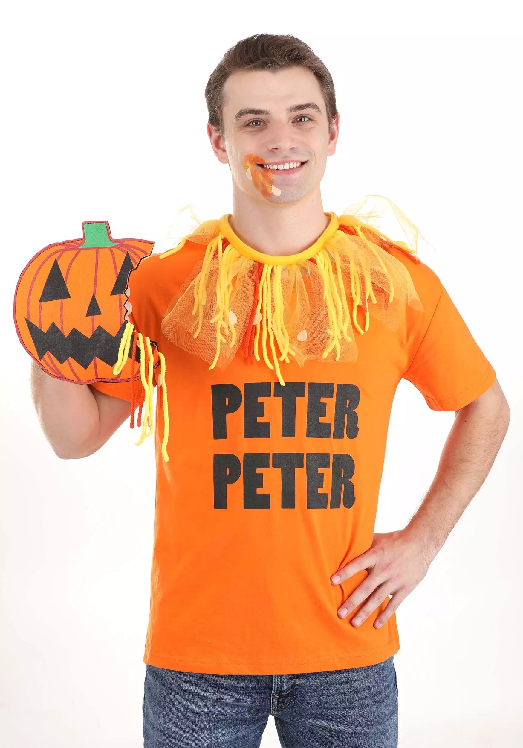 Easy, hilarious, unique: It doesn’t get better than those three qualities when it comes to a winning Halloween costume! This exclusive Peter Peter Pumpkin Eater Costume Accessory Kit includes an orange crewneck T-shirt that reads “Peter Peter” on the front in black letters. The felt and yarn fabric collar attaches in the back, and the set comes with a felt pumpkin that appears to have had a bite taken out of it. A band across the back secures it to your hand.