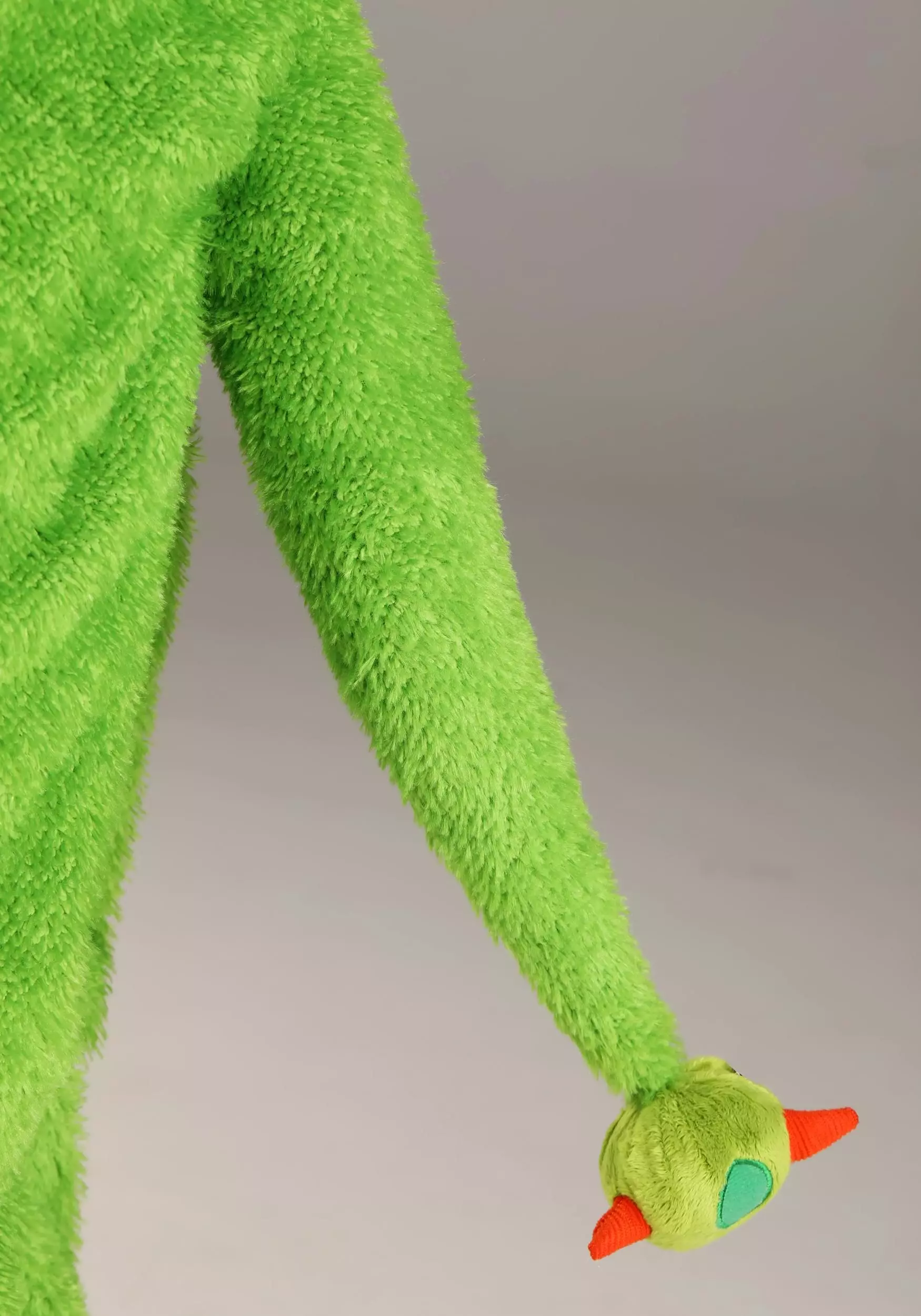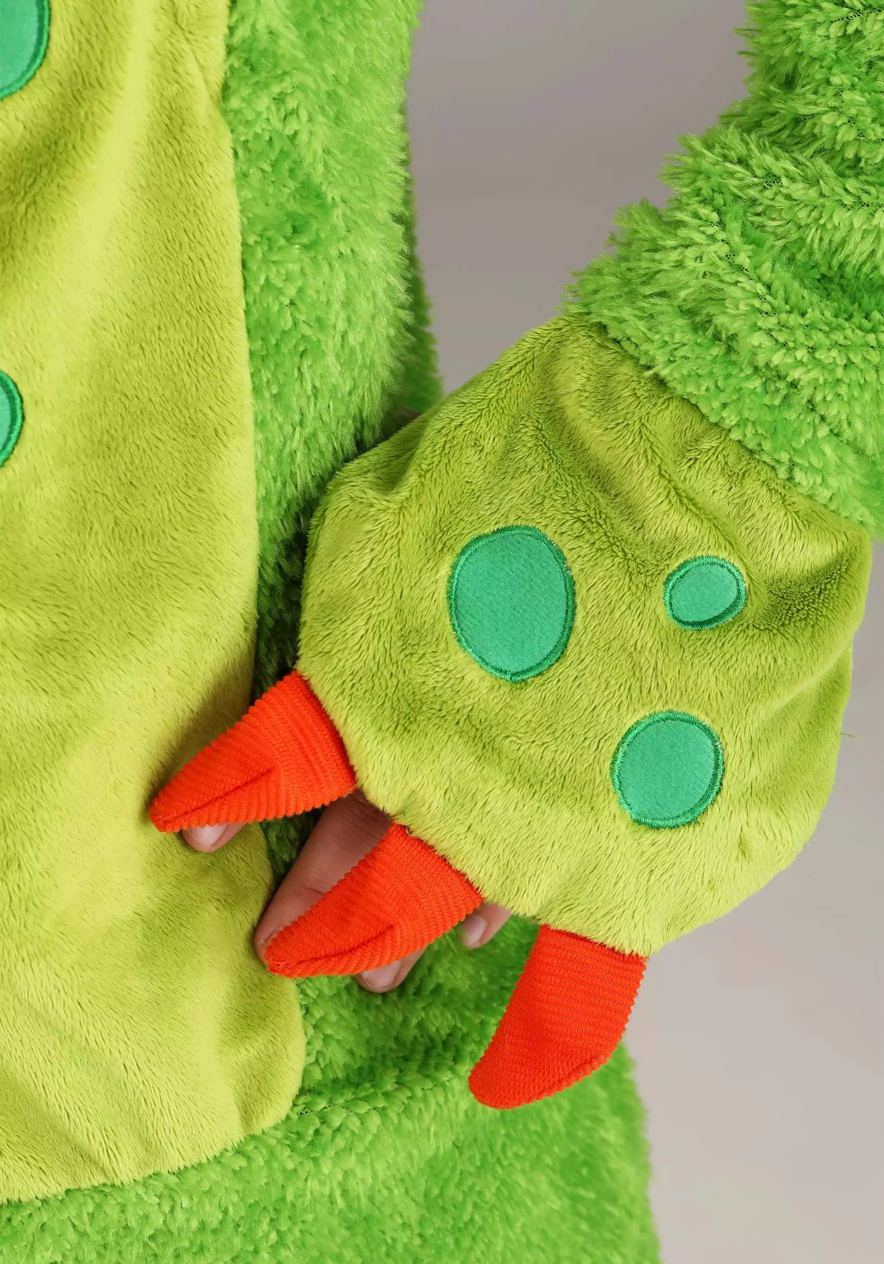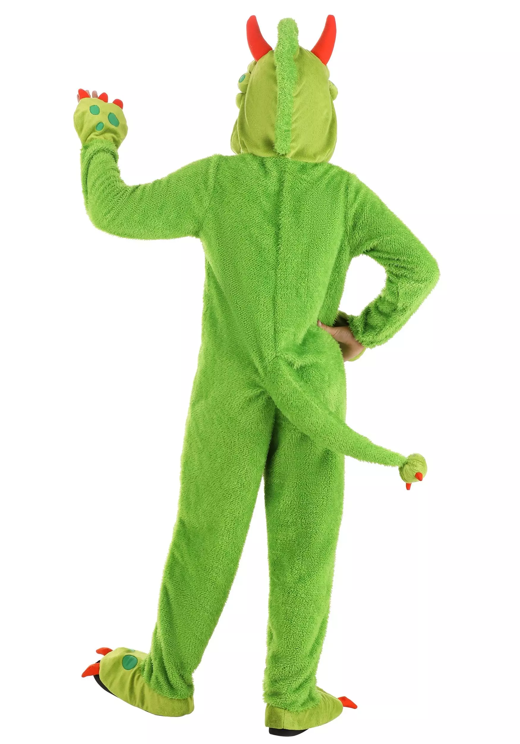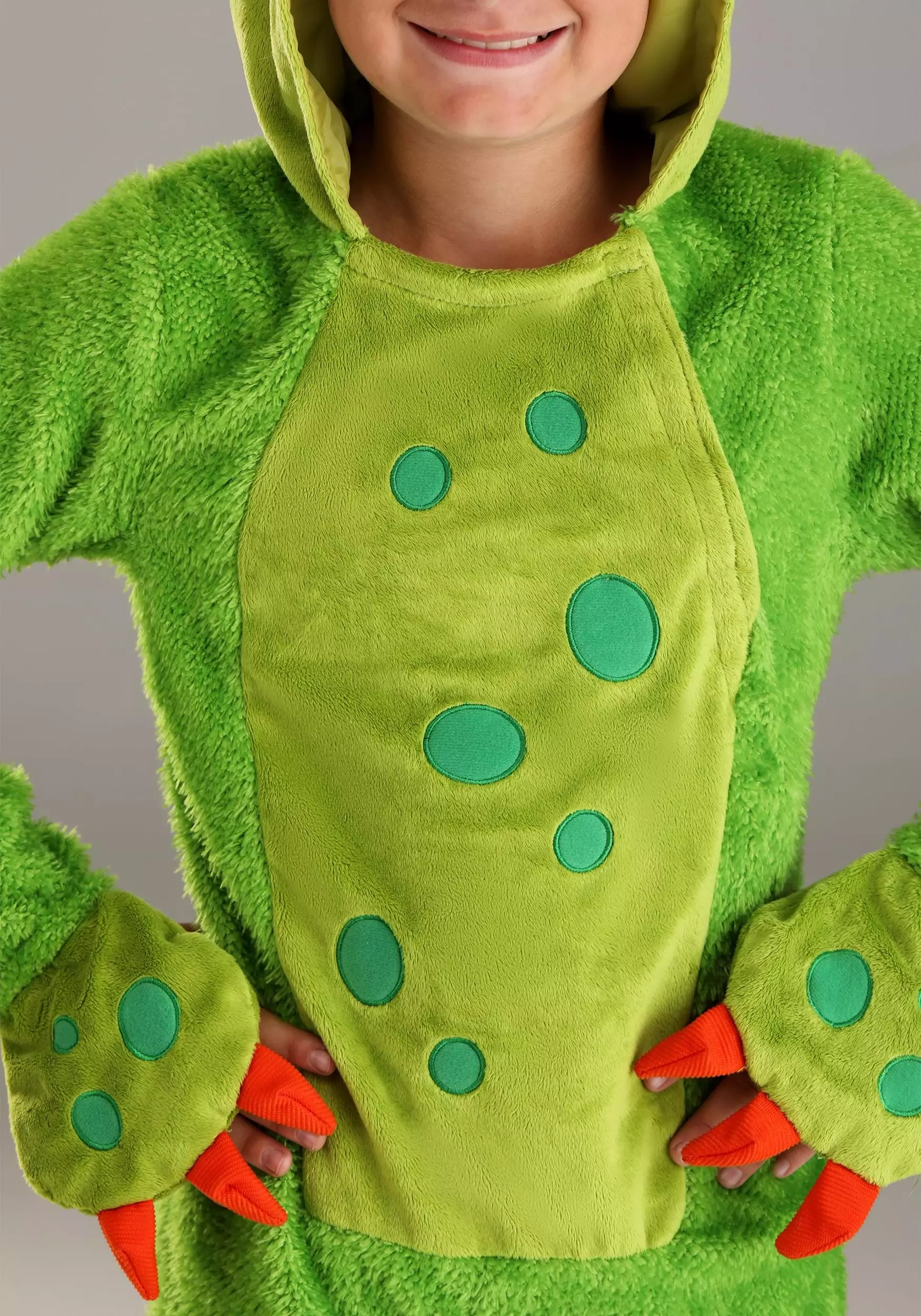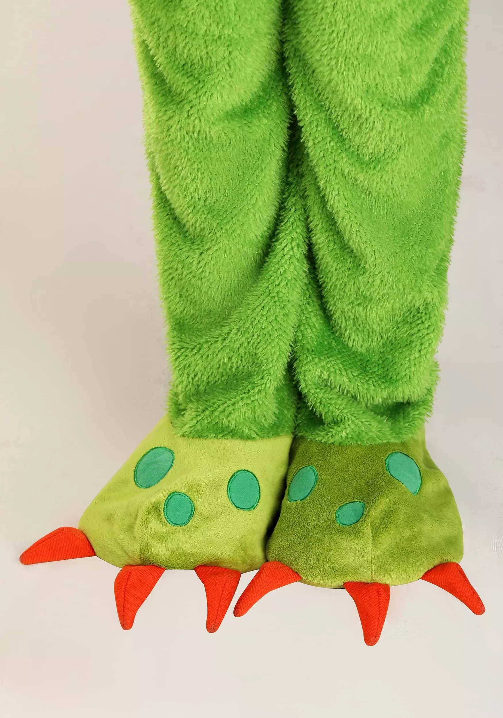 Be a scary monster or a scarily hilarious monster in this Little Green Monster Kid’s Costume! The exclusive, one-piece outfit is made of soft green velour, features a chest panel decorated with green polka dots, and has a stuffed tail sewn to its seat. Stuffed monster paws with orange felt claws are sewn to the suit’s wrists. The suit comes with matching foot covers. Pull up the hood to reveal monster eyes and ears as well as a row of front teeth above the face opening.Â